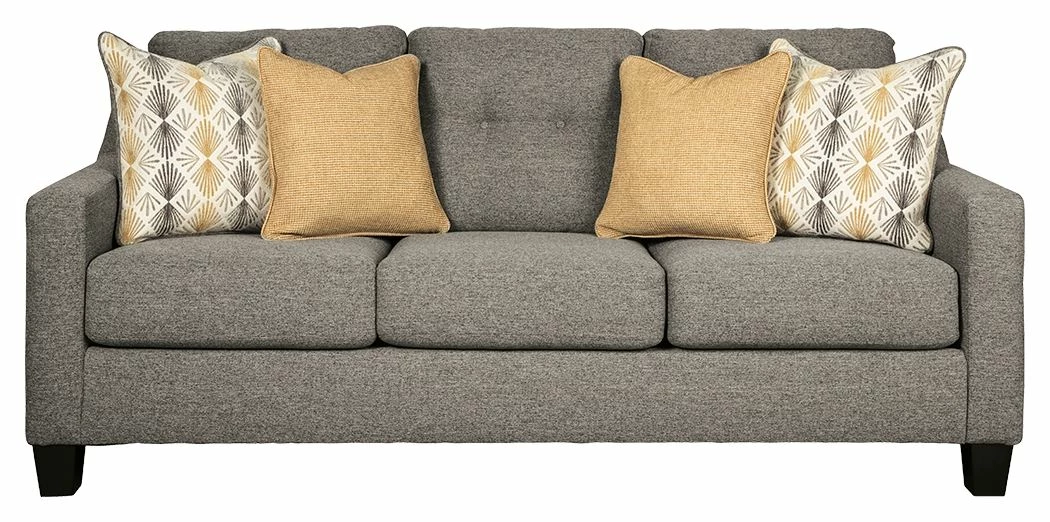 Cool and contemporary with a touch of mid-century flair, this graphite gray sofa is a sight for sore eyes after a long, hard day. The sofa’s box cushion styling is beautified with button-tufted accents and sloped track arms that go with the flow. Inspired by tailored menswear, the gorgeous gray upholstery with chenille-feel softness is complemented with solid and print pillows in butterscotch and gray.