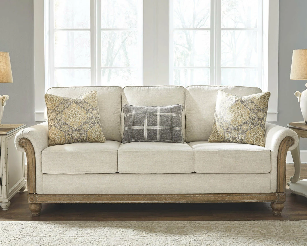 If you love traditional style—but want to leave the dark and heavier elements behind—this sofa is such a delightful choice. Fresh elements include light-tone feet, rail and arm panels with a weathered patina look for heirloom charm. The linen weave upholstery is a natural complement for a multitude of color schemes.