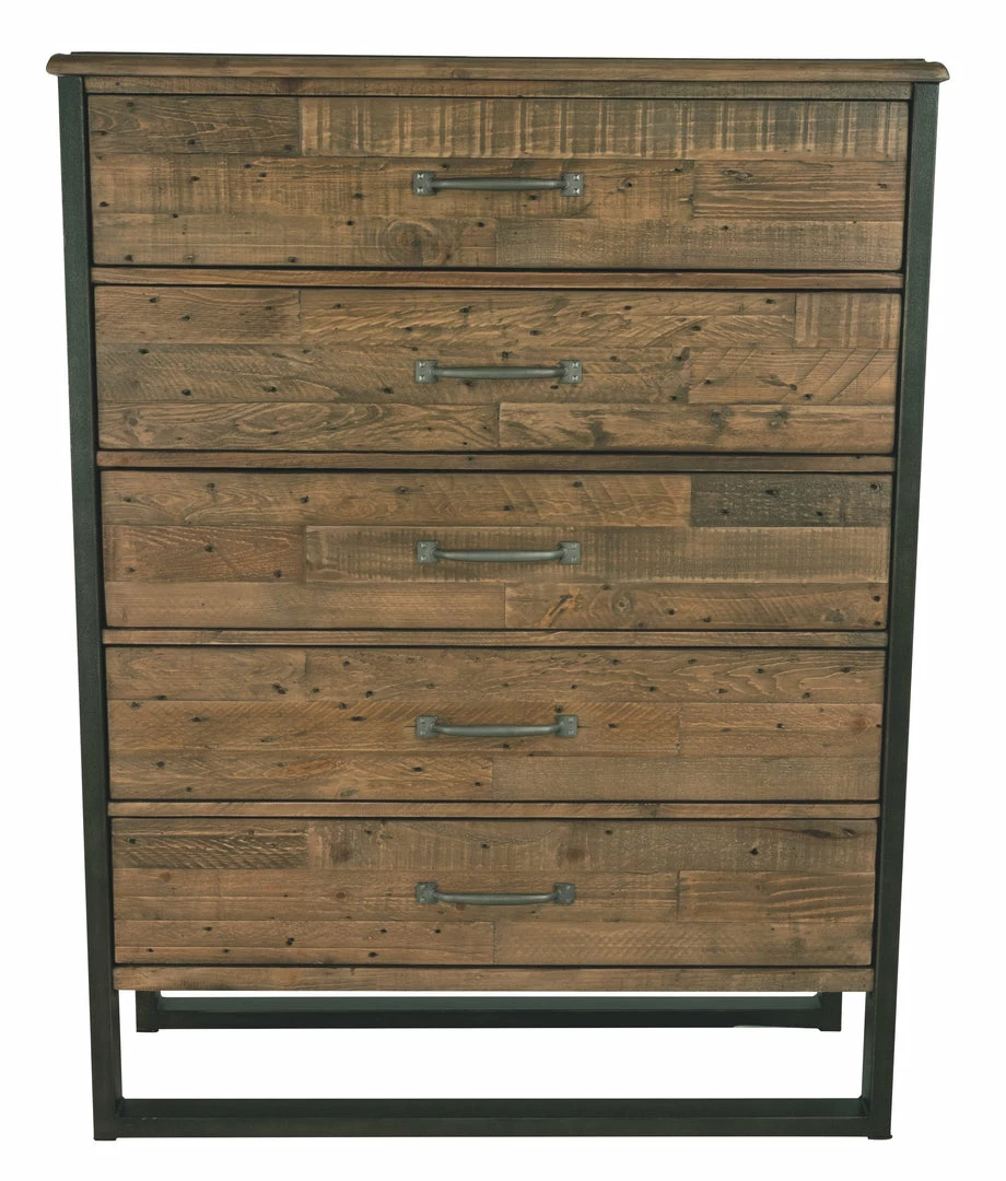 Load up on character. Scale back on fuss. As this chest proves to perfectionโless is more. Crafted of reclaimed pine, its ultra clean-lined, chunky profile showcases long butcher-block planking rich with tonal variation, nicks, notches, nail holes and a whole lot of raw beauty. The drawers offer ample room for a wardrobe. Metal leg brackets add a modern touch for a unique look.