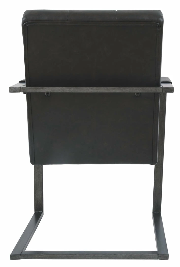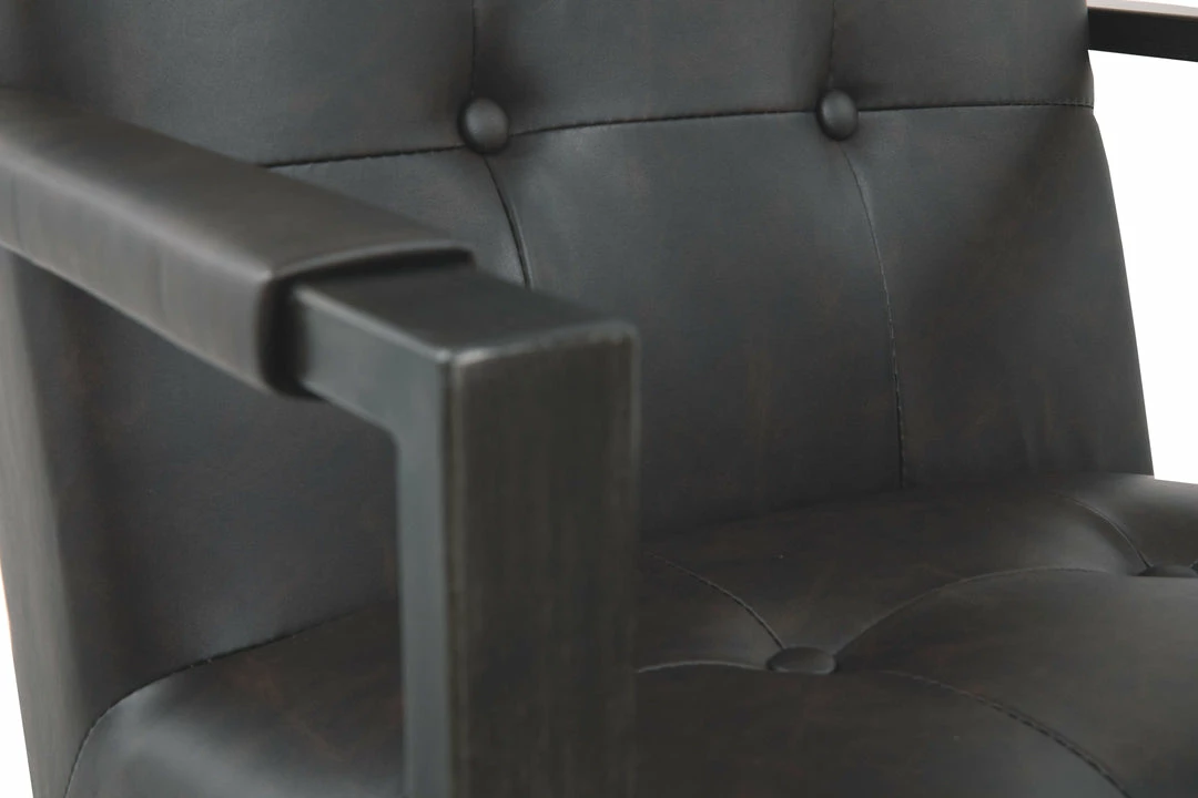 For fans of urban industrial design, this chair steals the show. Its metal C-frame in a blackened gunmetal finish is sleek, sculptural and ultra modern. Crafted for looks and comfort, the tufted box seat, wrapped in a โweatheredโ faux leather upholstery, is loaded with retro chic flair. Whether paired with Starmoreโs home office desk or dining room table, itโs a feast for the eyes.