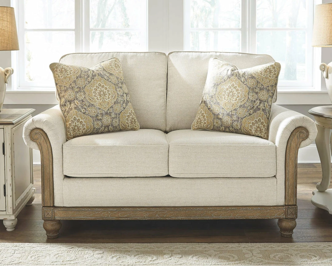 If you love traditional styleโbut want to leave the dark and heavier elements behindโthis loveseat is such a delightful choice. Fresh elements include light-tone feet, rail and arm panels with a weathered patina look for heirloom charm. The linen weave upholstery is a natural complement for a multitude of color schemes.