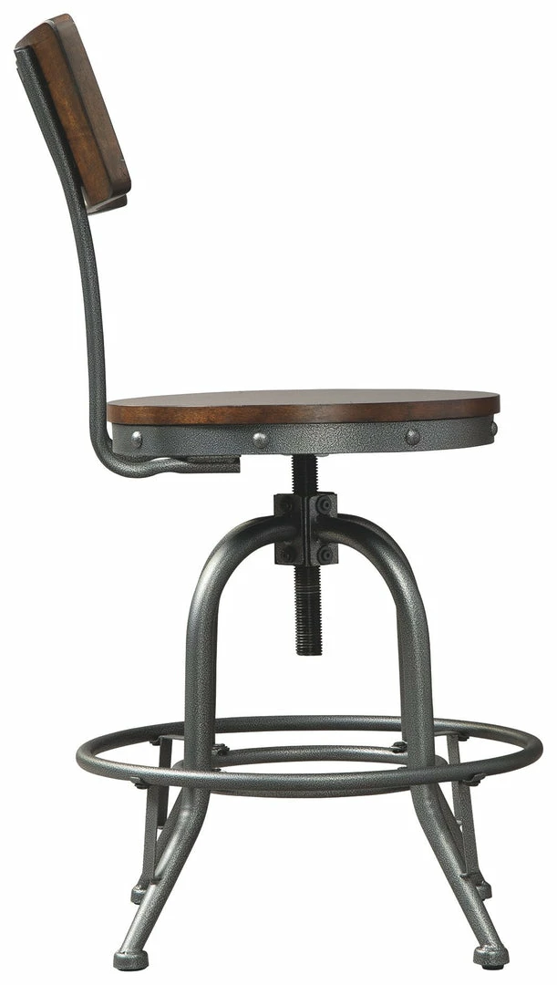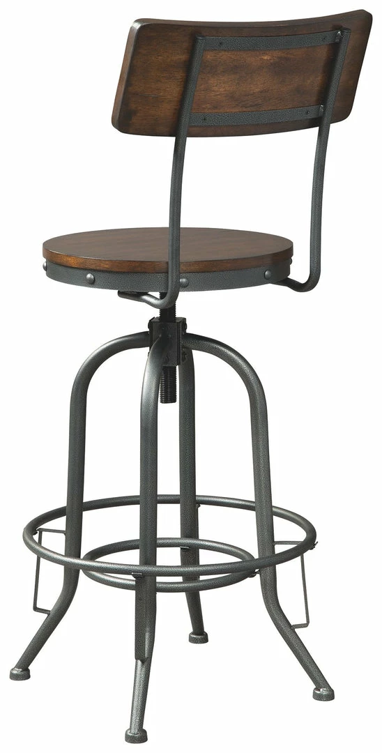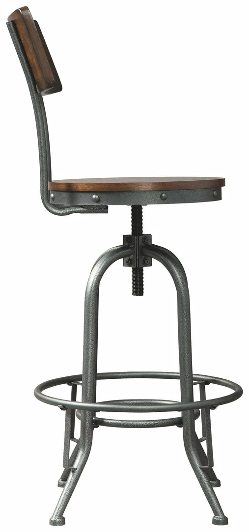 Take casual dining to new heights with this bar stool. Admire how the dark bronze-tone powder coat metal finish and planked looking back and seat reflect the popular rustic, industrial style. Decorative details include metal rivets and curved metal design. A convenient swivel feature also adjusts the seat height, perfect for flexibility.