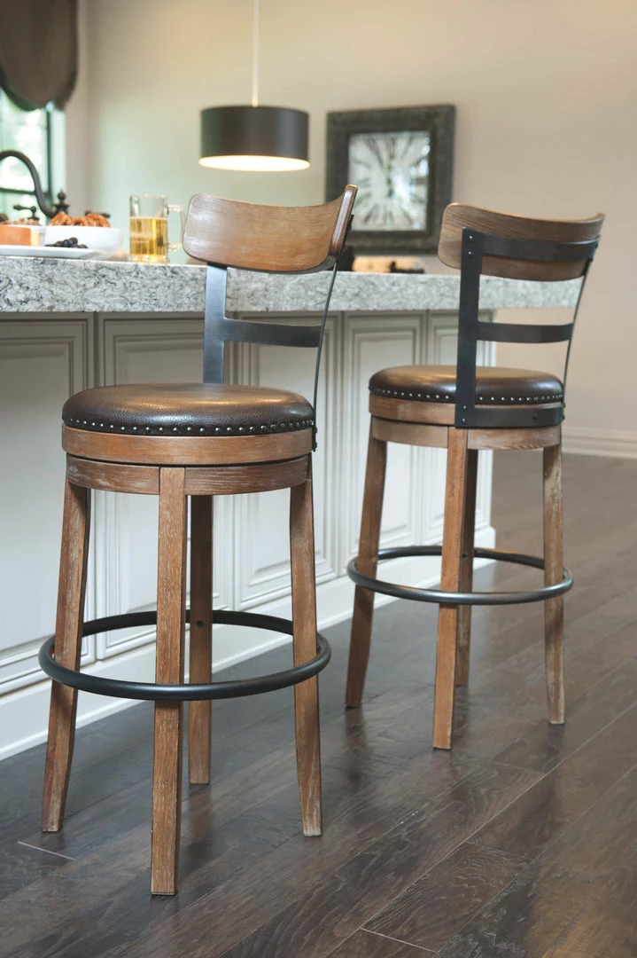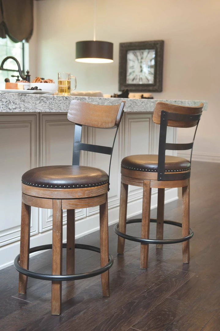 This striking counter height bar stool serves a sense of refinement without all the formality. A 360-degree spin element keeps you in the flow of conversation, while faux leather upholstered seating incorporates comfort and easy cleanup. The frameโs signature finish with a wire-brushed effect and gray undertones exudes an easy, relaxed sensibility.