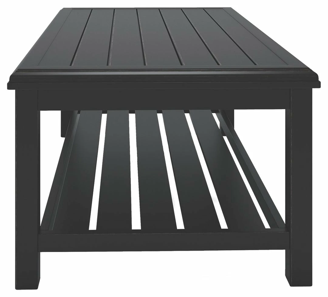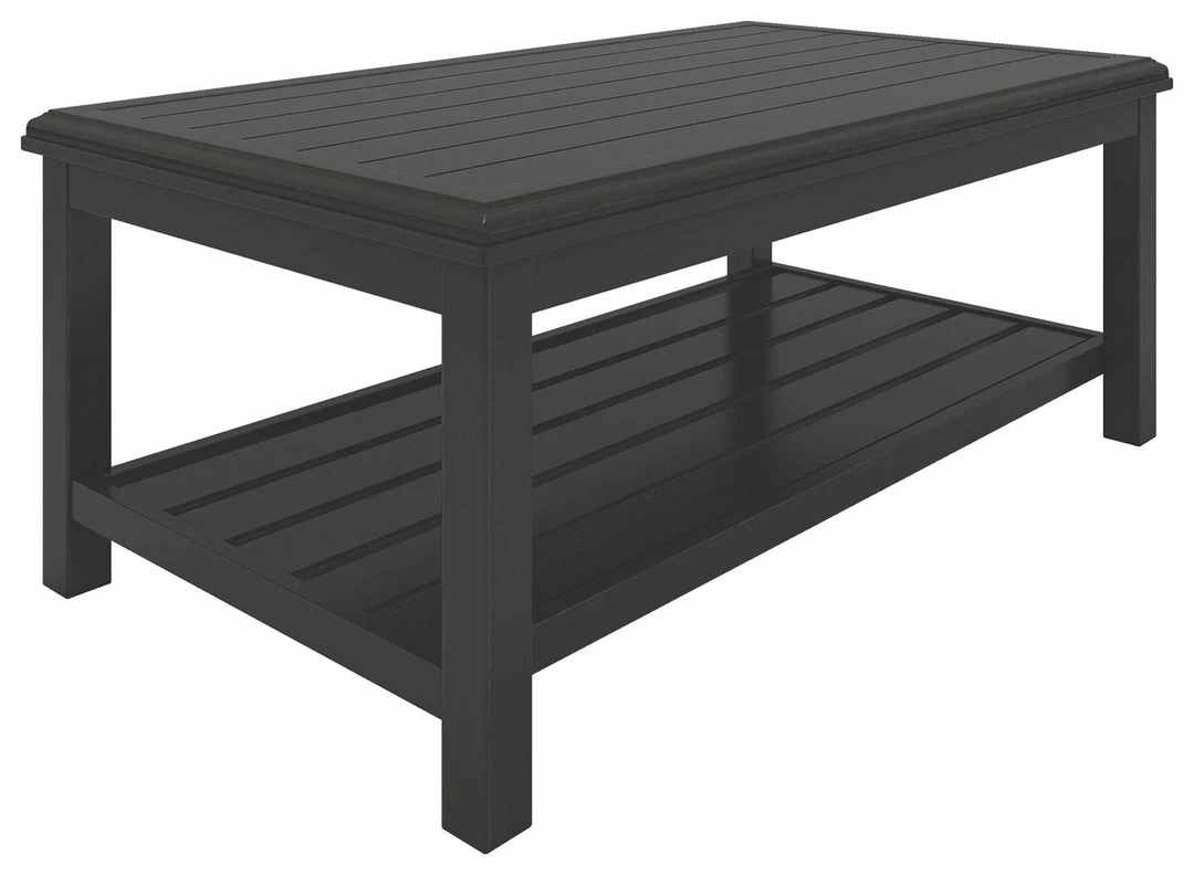 Be it for entertaining or everyday use, this outdoor coffee table is a royally handy addition to your outdoor living space. Durable and rust proof, the dark brown-finished aluminum construction with a hint of distressing is made for season after season of enjoyment. Includes slat-style top and shelf for easy water drainage.