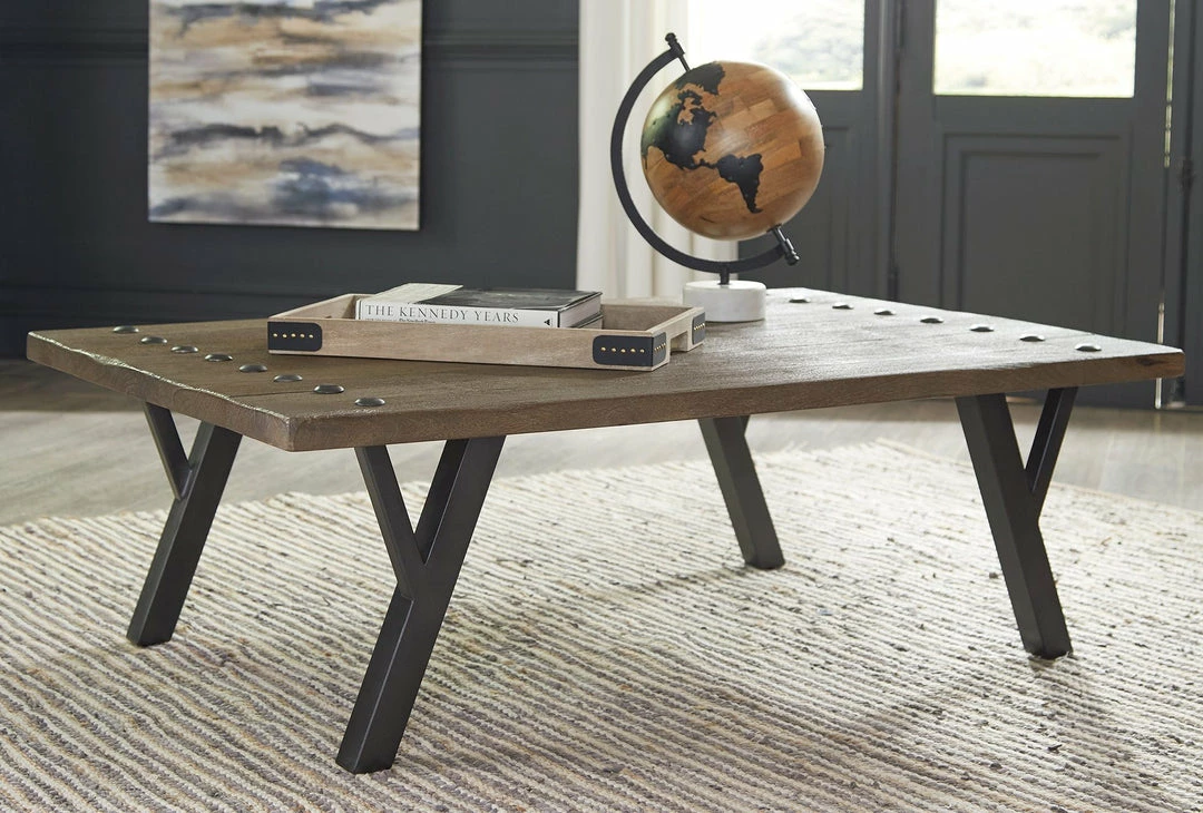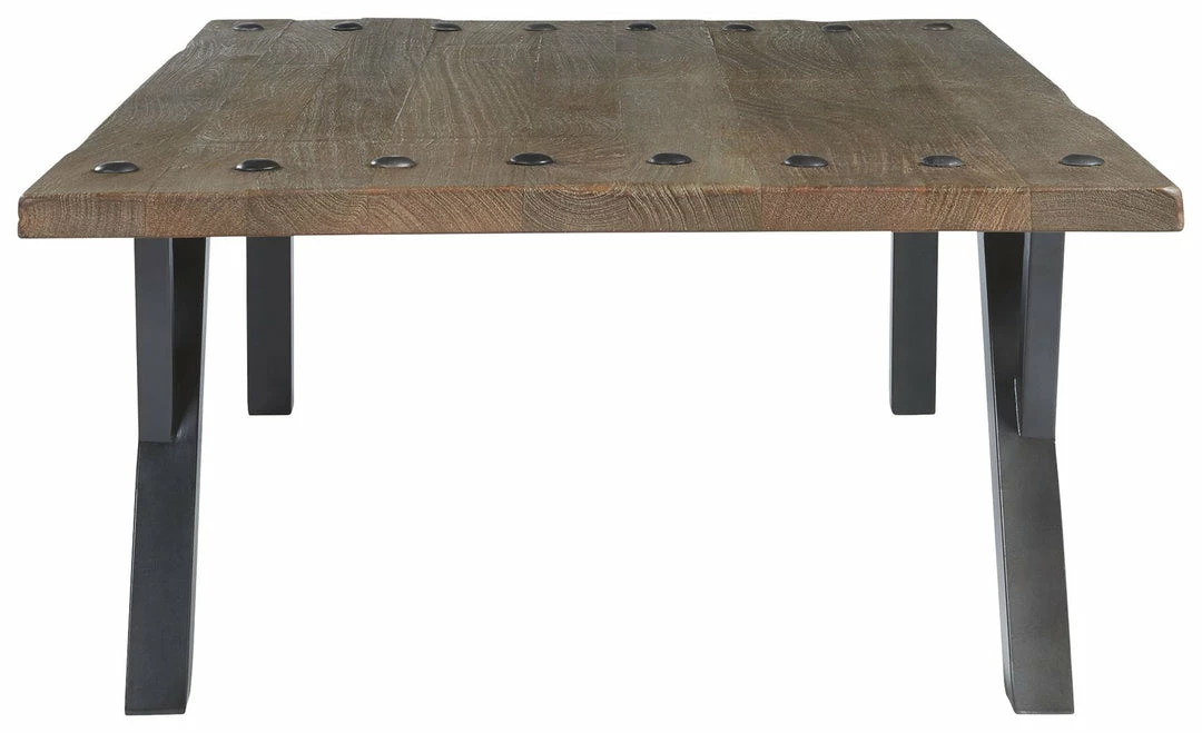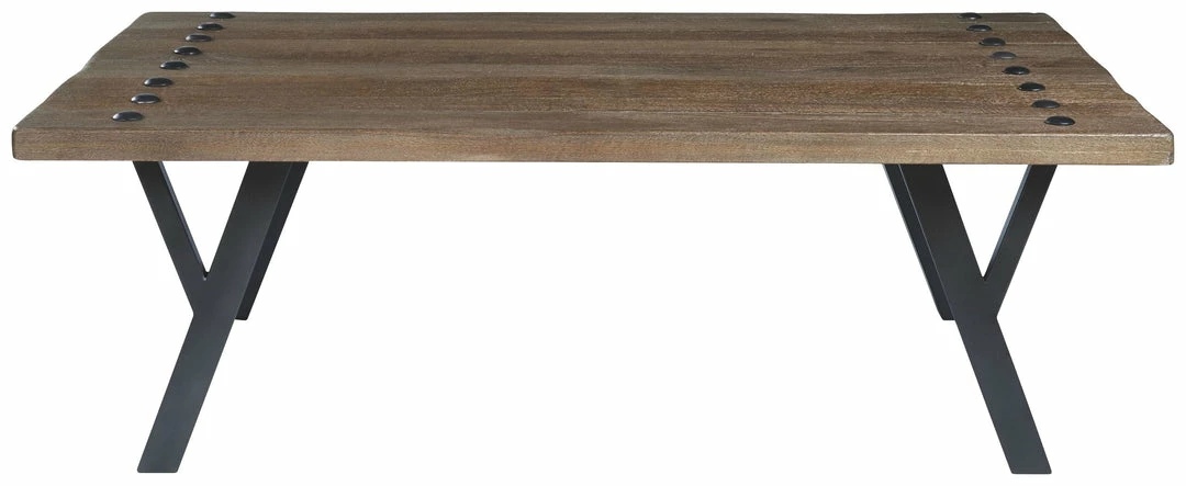 This coffee table is a riveting example of urban casual design. The plank effect mango wood top is finished in a clear nutmeg color for a naturally beautiful effect. Striking cantilevered metal legs and rivet head accents tie the look together for a well-edited aesthetic.