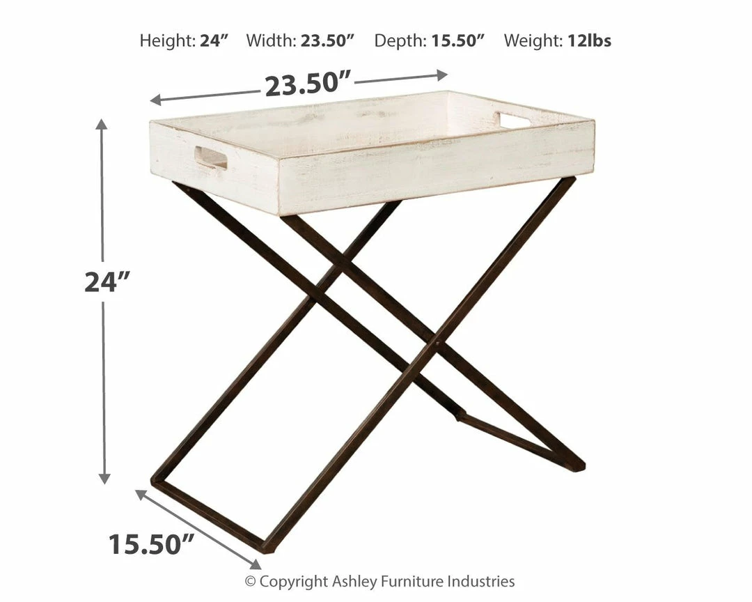 Casually cool style served with a side of bygone charm. Pairing solid wood and metal, this accent table with โtrayโ top commingles a distressed aesthetic with clean-lined, modern appeal. Combination of three finishes gives this simply striking table so much distinction.