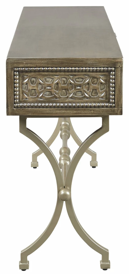 This console sofa table is style with a purpose. This casual look flaunts a medallion pattern along the front. Champagne color finished metal complements the antiqued gray finished wood. Show off decor on top. Rest assured X-base is as strong as it looks. Functional drawer allows you to keep knickknacks out of sight.