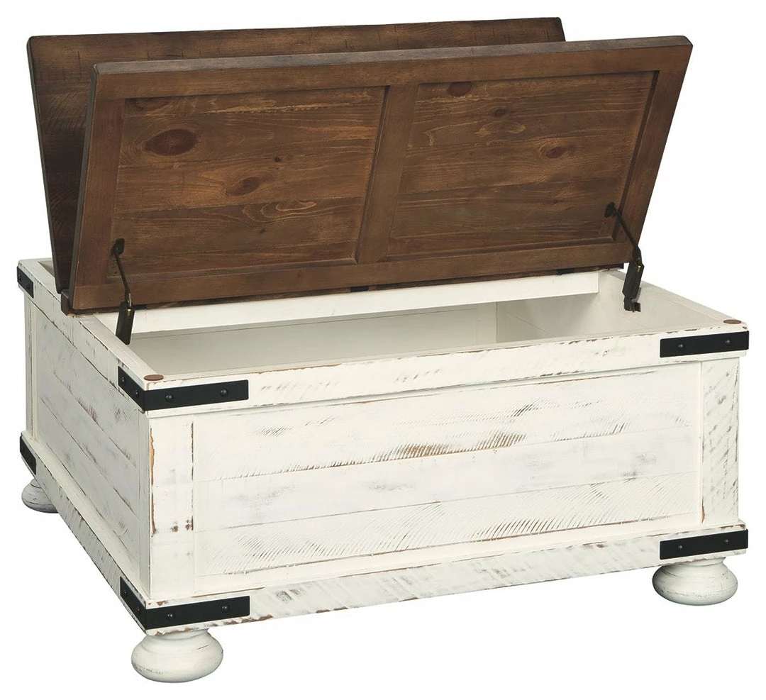 Double take. Sporting a two-tone finish, dual-sided lid design and expansive storage space, this square coffee table takes the art of rustic farmhouse living to a new level. Designer touches include plank-effect styling, heavy distressing and industrial bracket hardware.