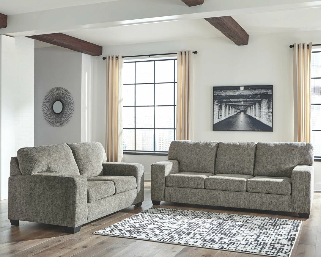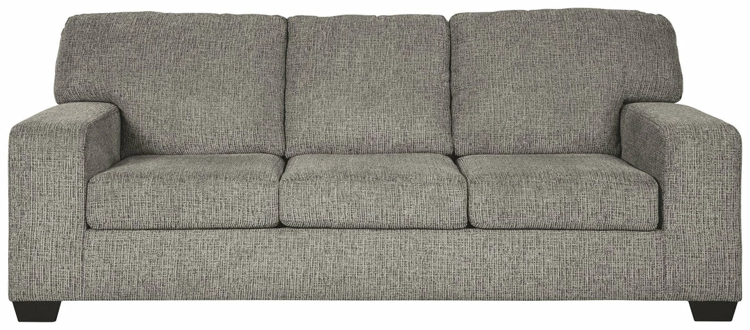 This handsome sofa is a blank canvas for you to style to your heart’s content. Warm, granite-gray color sets the scene for your favorite throw pillows. Cushions of comfort delight with softly textured chenille fabric. Oversized track arms bring contemporary design in for the win.