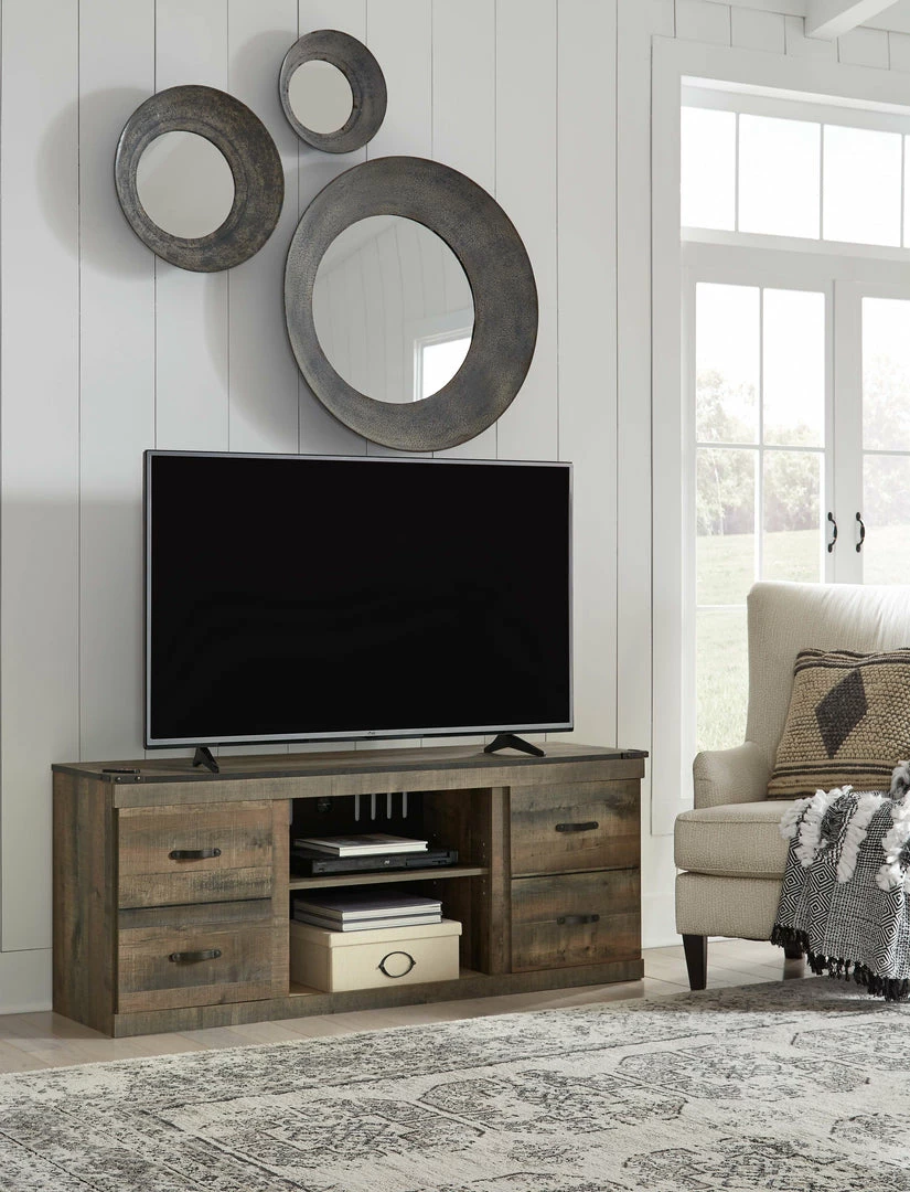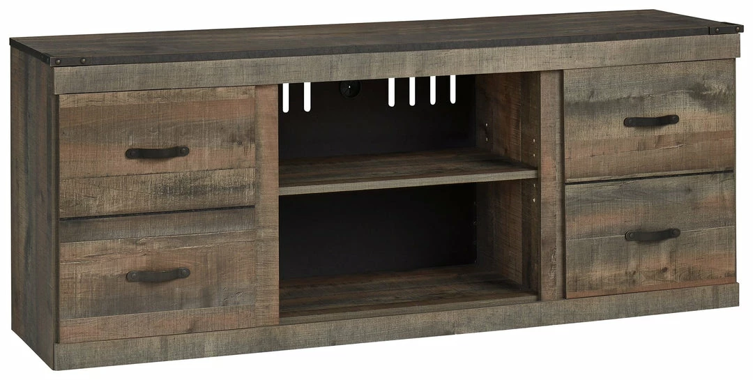 Entertain a rugged yet refined sense of style with this TV stand. Rustic finish and plank-style details pay homage to reclaimed barn wood, while faux metal banding with nailhead accents infuses a touch of industrial cool. Ultra clean lines ensure a look that can go from the country to the city and feel equally at home. Opt for the optional fireplace insert (sold separately) for added warmth.
