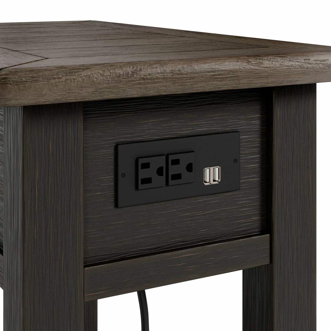 Quality crafted and richly styled, this rectangular chairside end table is sure to charm. Two-tone aesthetic pairs a weathered grayish brown tabletop with a textured wire brushed base in black with rub-through effect. Built-in shelf offers handy display space. Integrated 110V power supply with dual USB charging ports makes it so easy to your personal devices powered up.