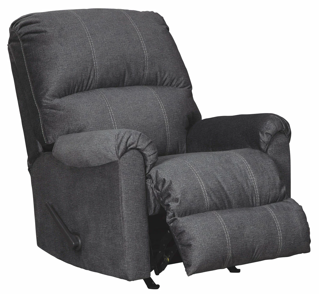 Dressed to impress even the most discerning urban hipster, this rocker recliner in charcoal gray rocks a cool look with an even better feel. Rest assured, this designer recliner is covered in a padded microfiber upholstery thatโs love at first touch. Accentuating the clean lines and channel tufting: prominent jumbo stitching that adds a fresh, fashion-forward element and distinctive flair.