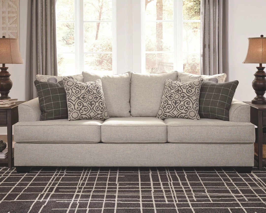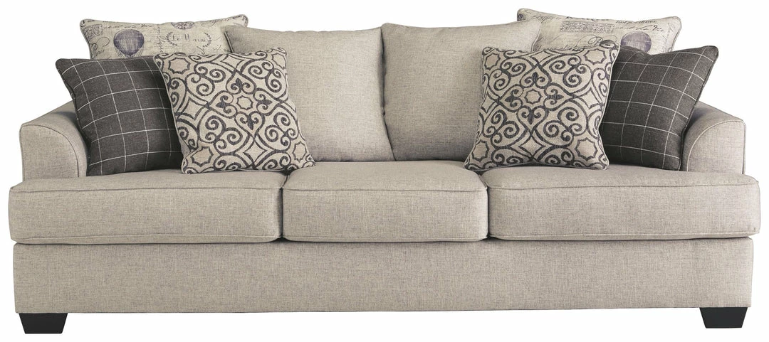 For the style enthusiast on a mission. This sofa takes a unique approach to design. Two back cushions flaunt a vintage-inspired “Paris” script. Throw pillows continue the charm with gray-infused scroll and plaid patterns. Flared arms and neutral hue lend to transitional appeal. Covered in a luxurious linen-like chenille, its softness and luxurious comfort will keep you coming back.
