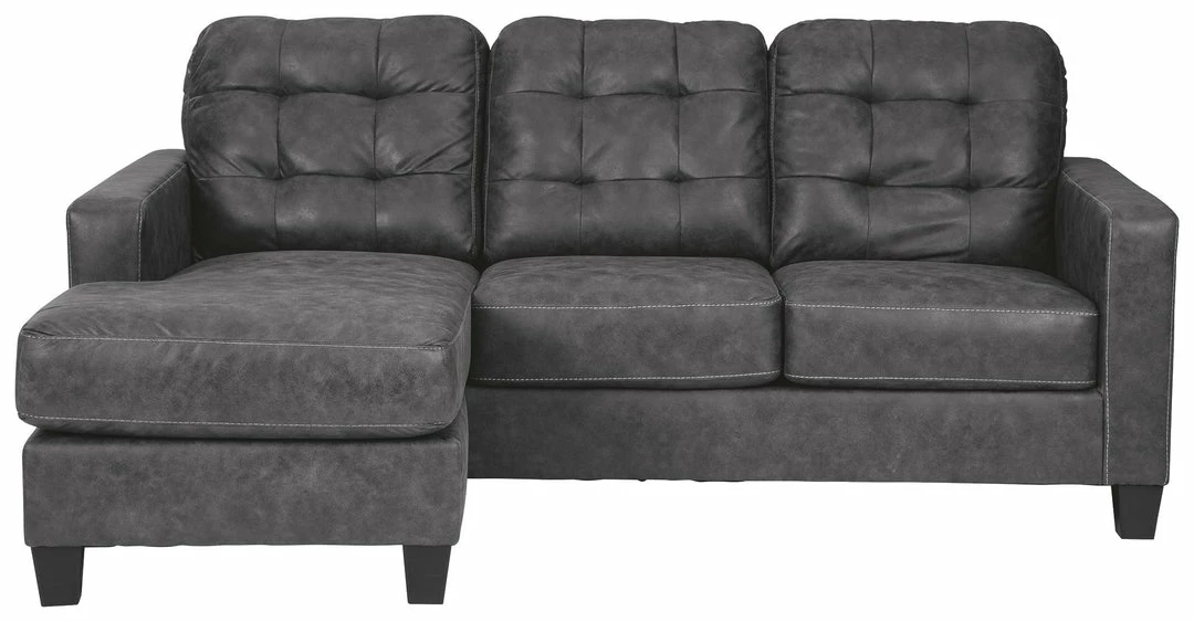 This ultra-contemporary sofa chaise invites you to spread out and make yourself comfortable. Linear track arms offer a clean, sleek aesthetic, while tufted box cushions are a nod to mid-century design. Rest assured, a movable ottoman and reversible seat cushions allow you to place the chaise on either side for the perfect fit. Gunmetal gray faux leather offers the cool, weathered look you love and touchably soft feel you crave.