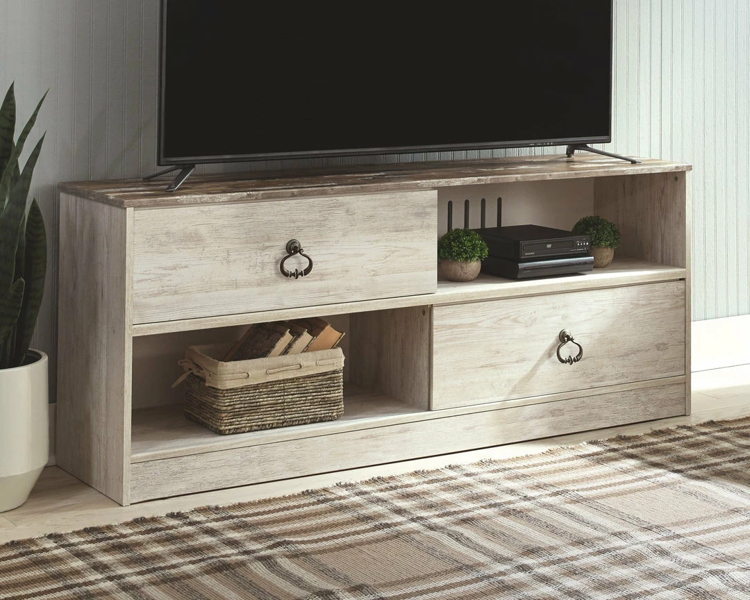 This TV stand is the ultimate statement piece for your coastal cottage or shabby chic inspired retreat. Whitewash finish is wonderfully easy on the eyes. Paired with the TV standโs unique plank-style top, itโs a driftwoody look that has our minds drifting away to beachy-keen escapes.
