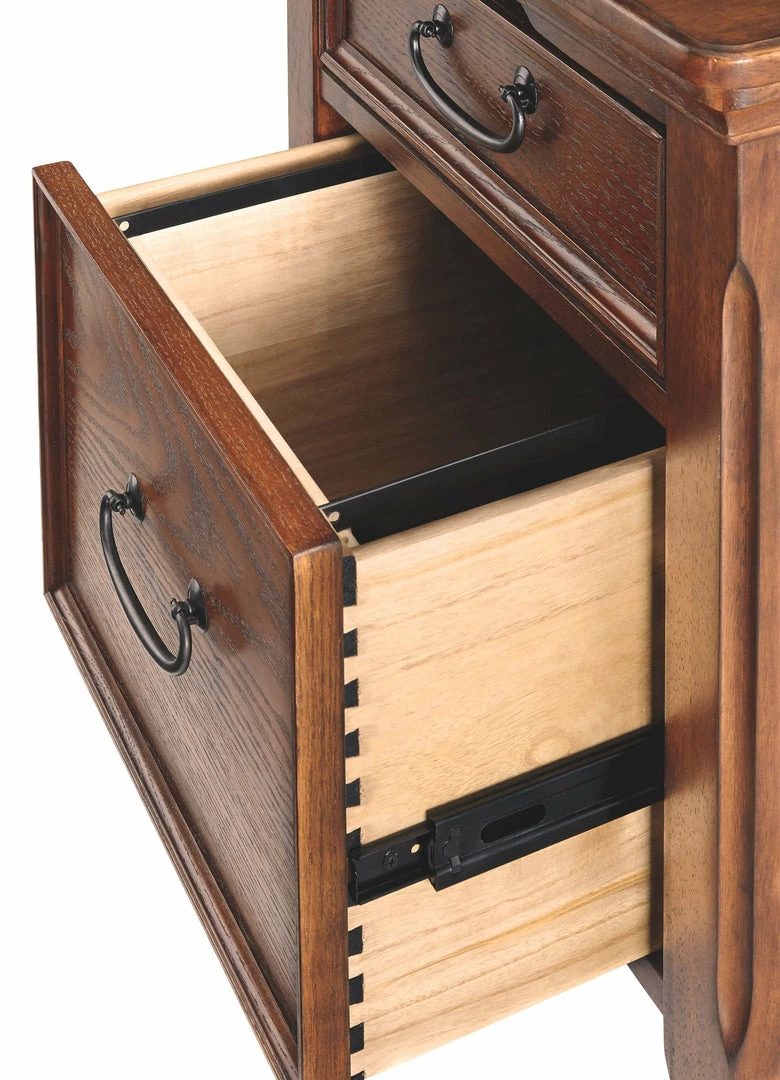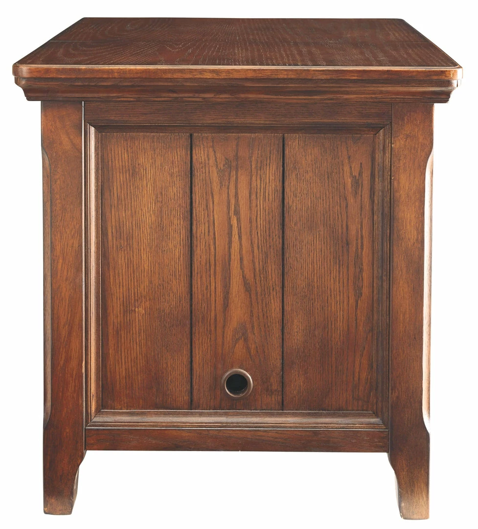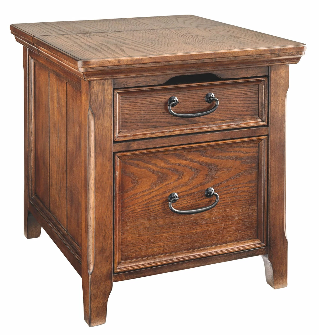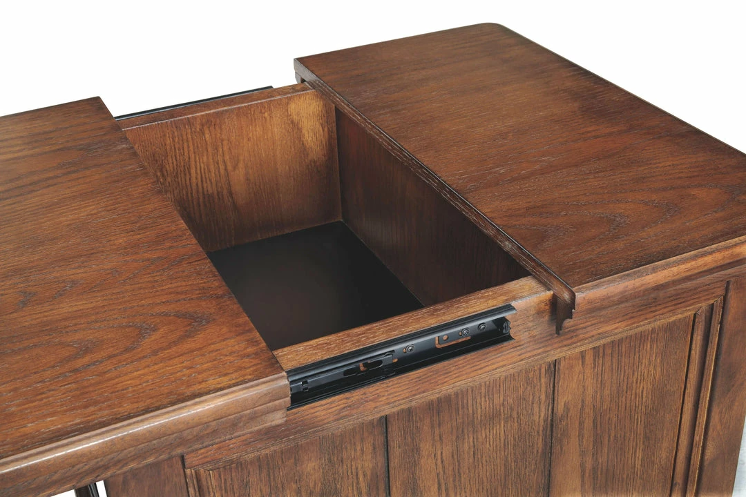 With its heirloom air and richly edited sense of style, this media end table is vintage inspiration meets modern convenience. On the bottom: a good old-fashioned file cabinet. On the top: a clever drop door revealing a USB port and 3-prong power plugs. When youโre ready to put work to bed, slide the tabletop forward and tuck your laptop into the media storage compartment.