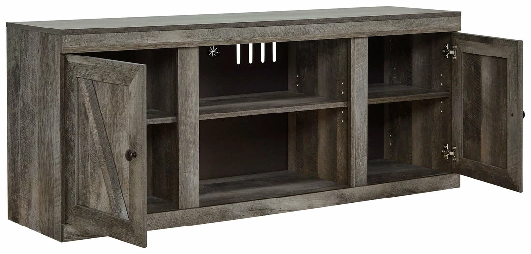 This TV stand is sure to win your heart with its daring take on modern rustic design. Its crisp, clean minimalist-chic profile is enriched with a striking replicated oak grain, thick plank styling and a rustic gray finish for that much more authentic character. Crossbuck detailing adds a brilliant barn door inspired touch. Opt for the optional fireplace insert (sold separately) for added warmth.