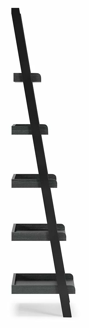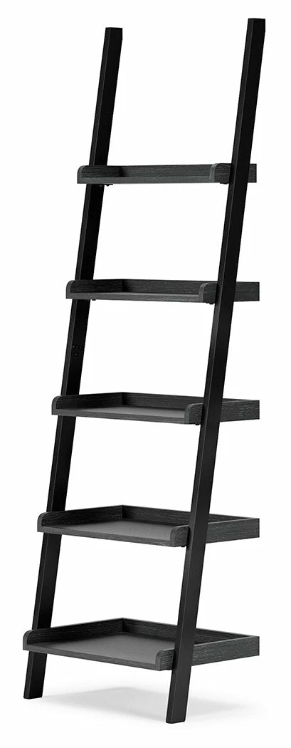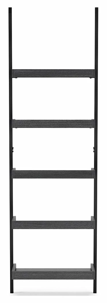 Elevate your style with this tall bookcase. Its leaning ladder design is right on trend and perfectly suited for small space living. Pairing a dark wood grain look with a black metal frame for modern appeal, this minimalistic bookcase with five gallery shelves is dressed to impress in a no-muss, no-fuss way. Load it up with books, decorative storage baskets or home accents. However you use itโwherever you put itโyouโll love its open-concept design and angular interest.