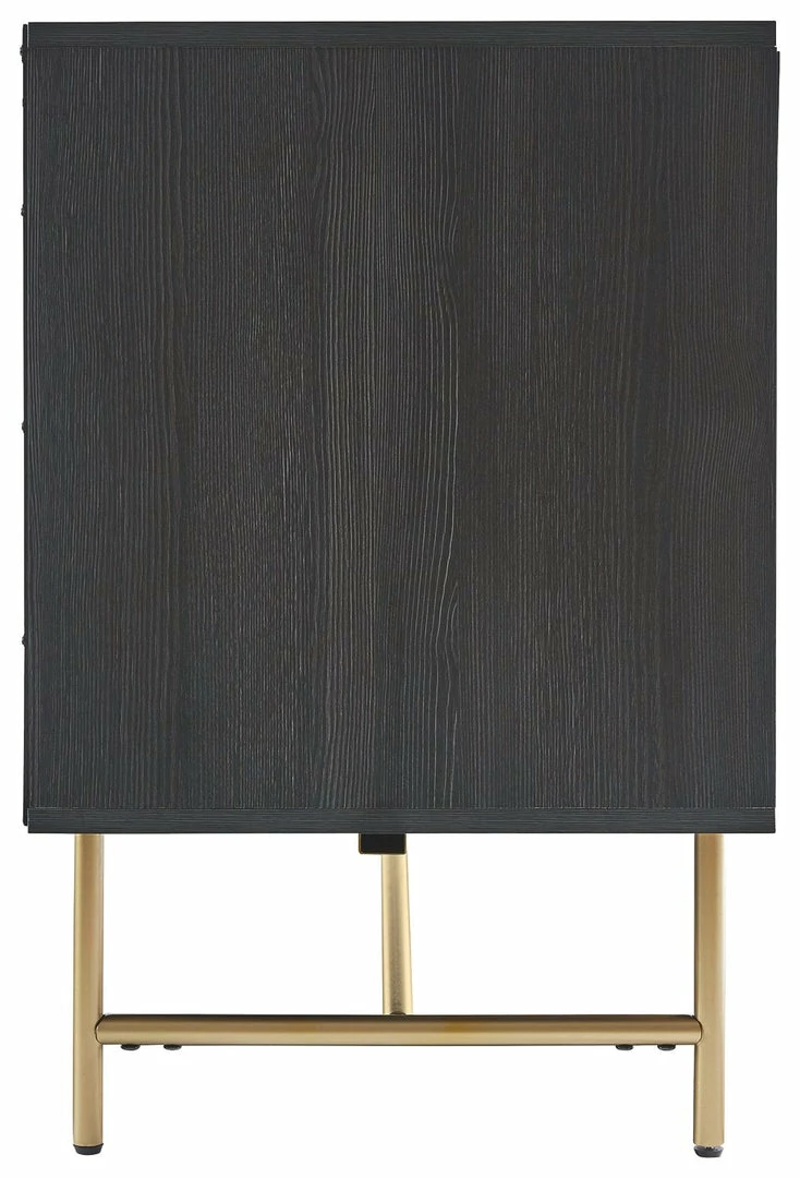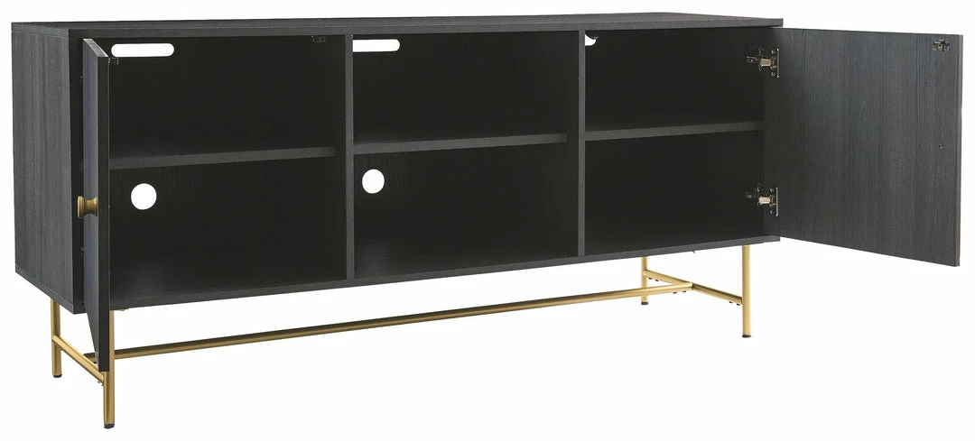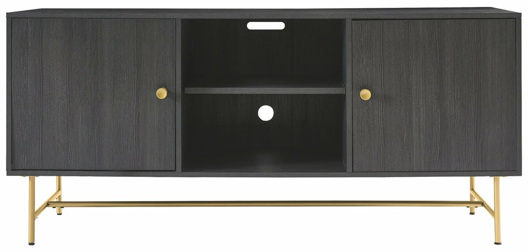 Grace your entertainment space (or home office or dining room for that matter) with this masterfully styled and wonderfully versatile TV stand. Pairing a dark wood grain look with sleek goldtone metal base, it’s beautifully in tune with contemporary and mid-century modern spaces.