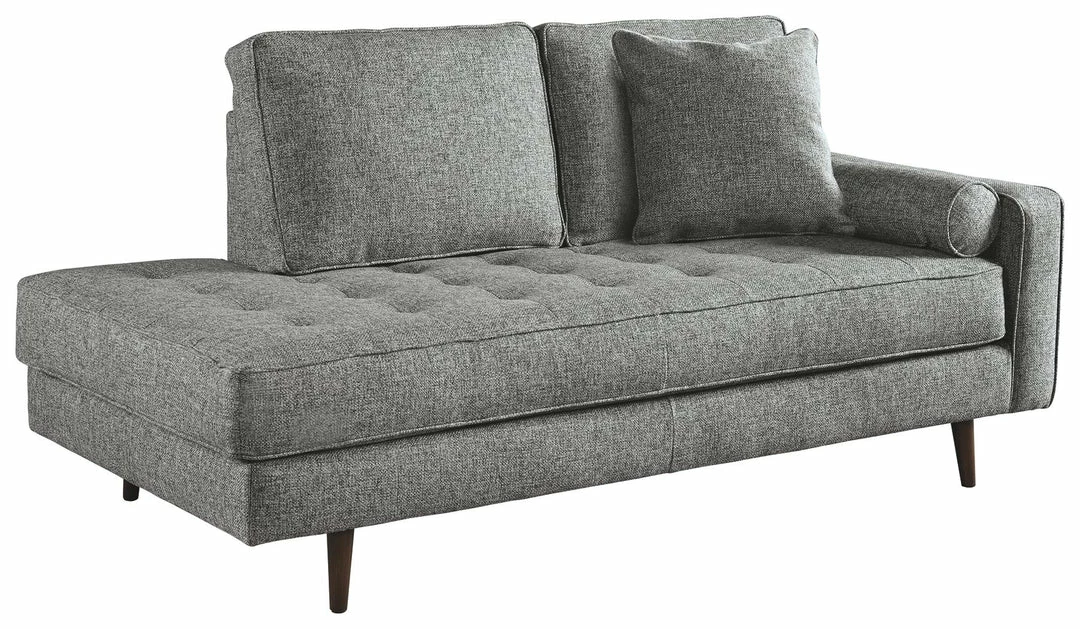 Feed your mid-century modern nostalgia with a contemporary twist in this corner chaise. Colored in an attractive gray, itโs upholstered in a timeless texture. Tapered peg legs are a nice revival. Linear profile with single toss pillow and bolster pillow add plenty of fresh style.