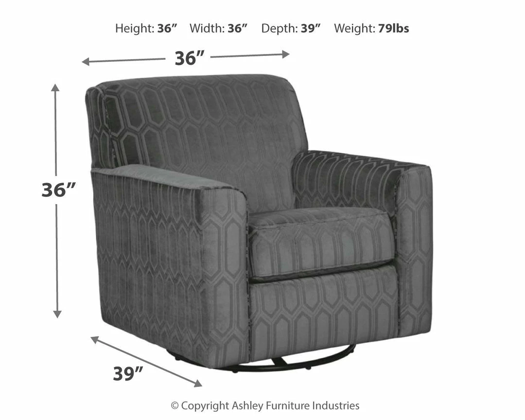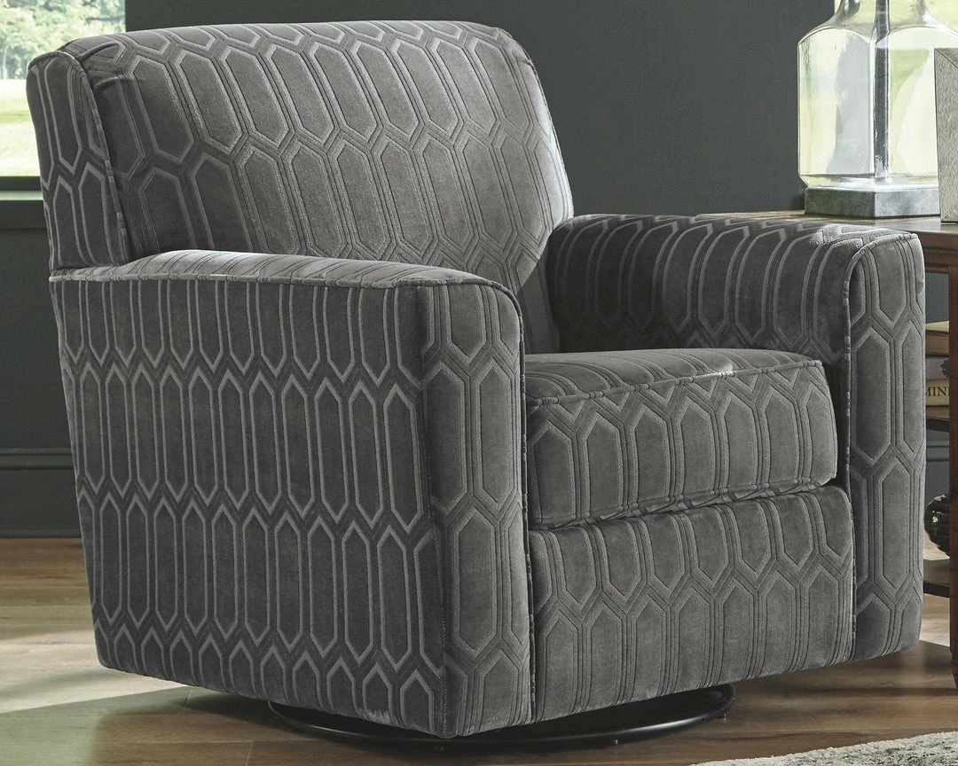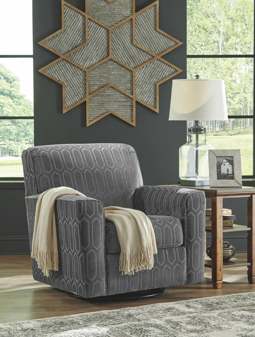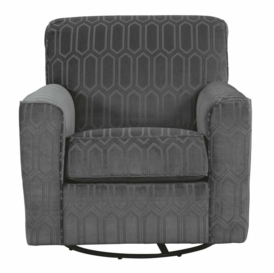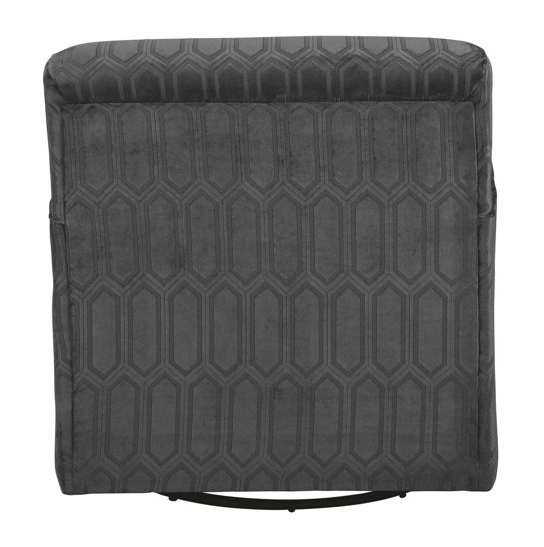 Style and comfort take a turn for the better in this swivel accent chair. Enriched with raised texturing and a chic geometric pattern, the swivel chair’s gorgeous graphite gray upholstery is a pleasure for the senses. A 360-degree swivel makes this chair that much more of a head turner.
