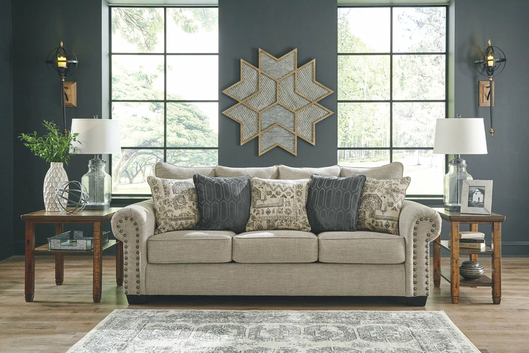 This sofa lets you make a high-style statement at a comfortably affordable price. Richly traditional roll arms are given a modern punch care of oversized nailhead trim in a black nickel-tone finish. Linen-weave upholstery in fresh and clean sandstone beige is complemented with textural pillows that are so plush to the touch.
