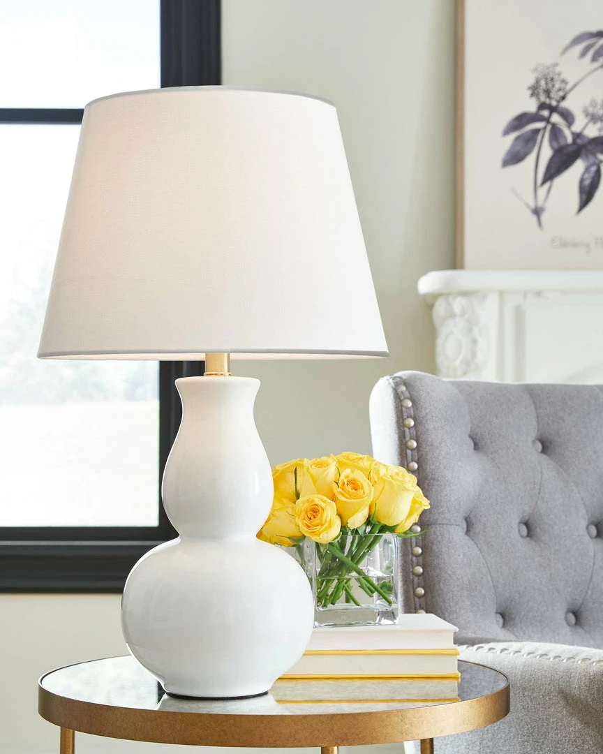 Soft lines and a curvy profile give a stylish look to this ceramic table lamp. Its glossy finish is paired with metallic details and topped with a white empire shade.