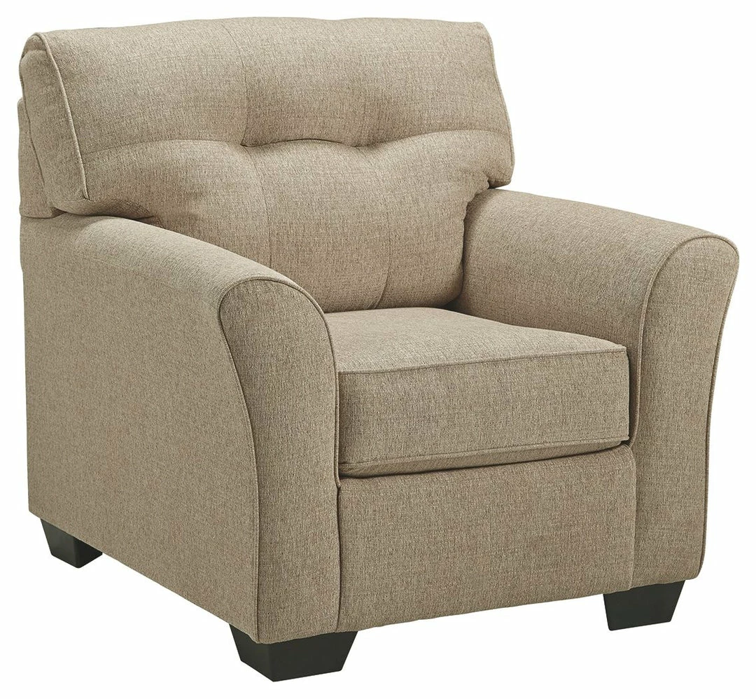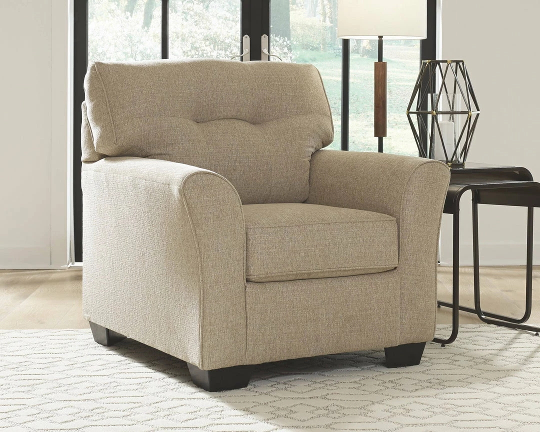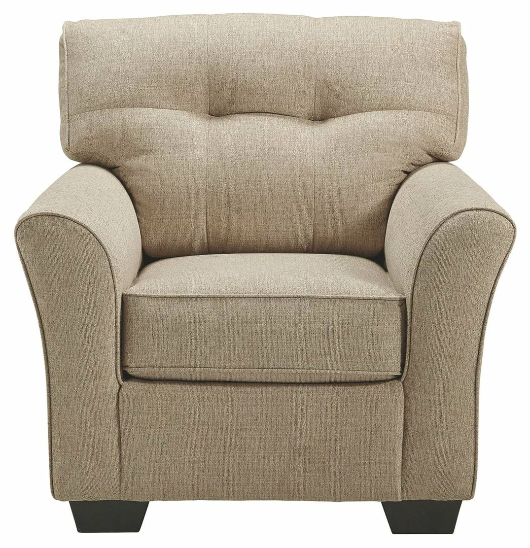 Stretch out in style with this richly upholstered chair. Tailored touches including flared armrests and tufted back cushioning infuse an upscale sensibility. Textural tan chenille fabric is loaded with neutral sophistication. What a brilliant way to bring everyday luxury to your living room, family space or bedroom retreat.