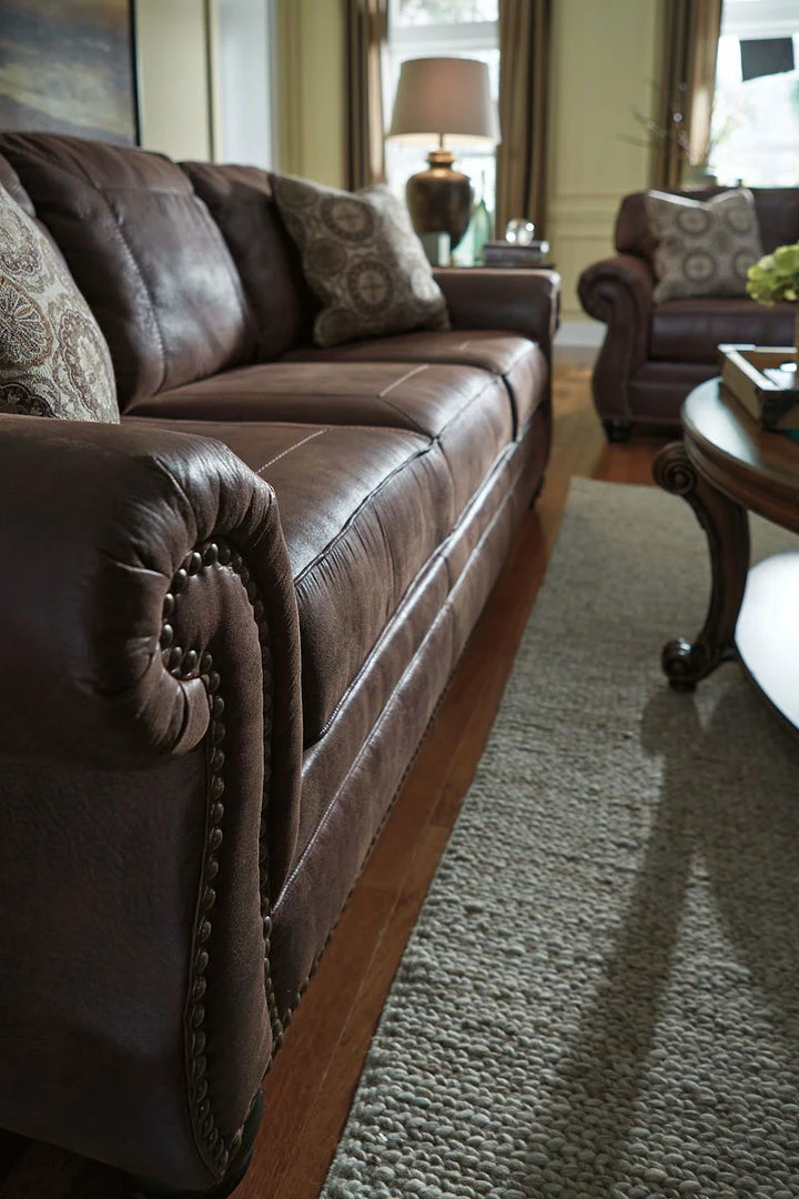 Rich with the traditional beauty of nail head accents and stylish window pane stitched details, the ’Breville-Espresso’ upholstery collection offers plush comfort elegantly wrapped within a rich faux leather upholstery. The sweeping rolled arms and rich finished bun feet perfectly work together to magically transform the d’cor of any living room environment.