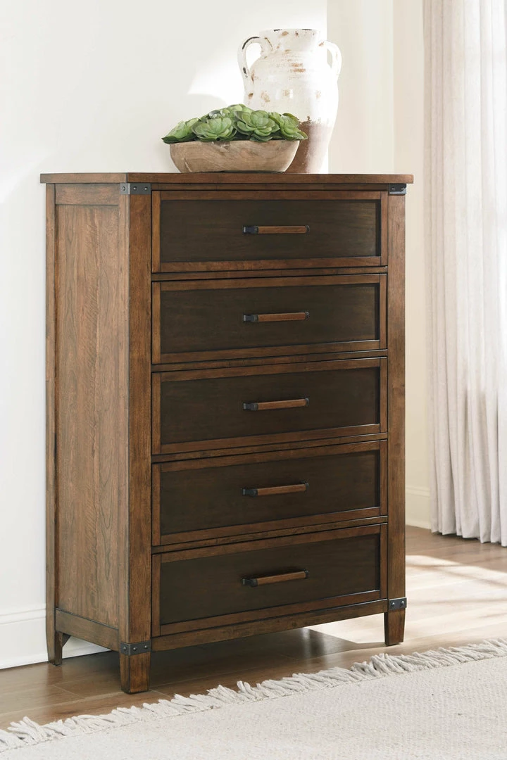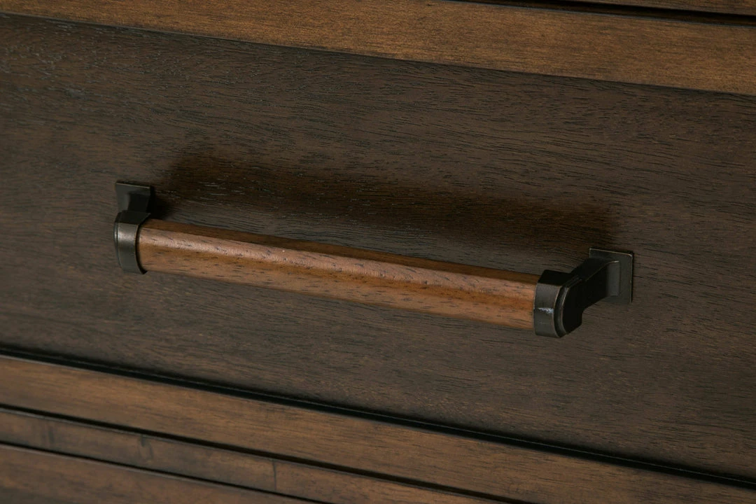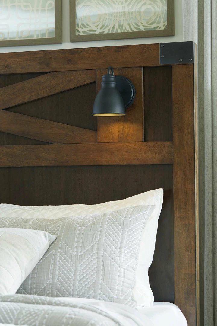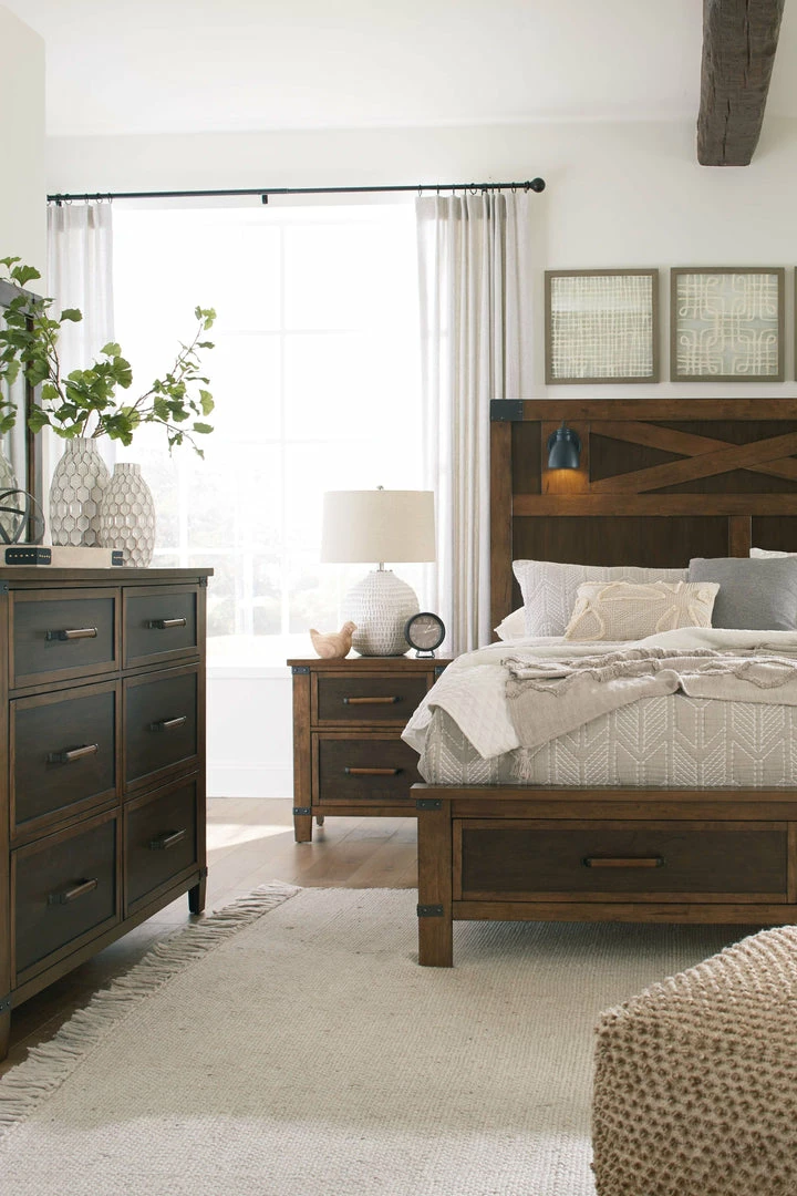 Casual two tone styling. Made with solid wood and Mango veneer. Finished with a walnut brown coloration accented with a dark burnt umber bed panels and drawer fronts. Panel bed with cross buck details with two overhead sconces for reading or ambient light. Well proportioned cases feature fully finished drawer boxes with dovetail construction and ball bearing side glides. Custom designed wooden bar pulls with metal keepers. Night stand includes a 110V power supply with dual USB charging ports. Upper drawers have black felt bottoms.