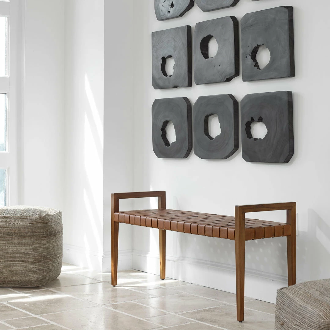 Genuine Cognac Leather Straps Are Woven Together In A Basket Weave Design To Create A Mid-century Look, Accented By A Solid Naturally Finished Teak Wood Frame.