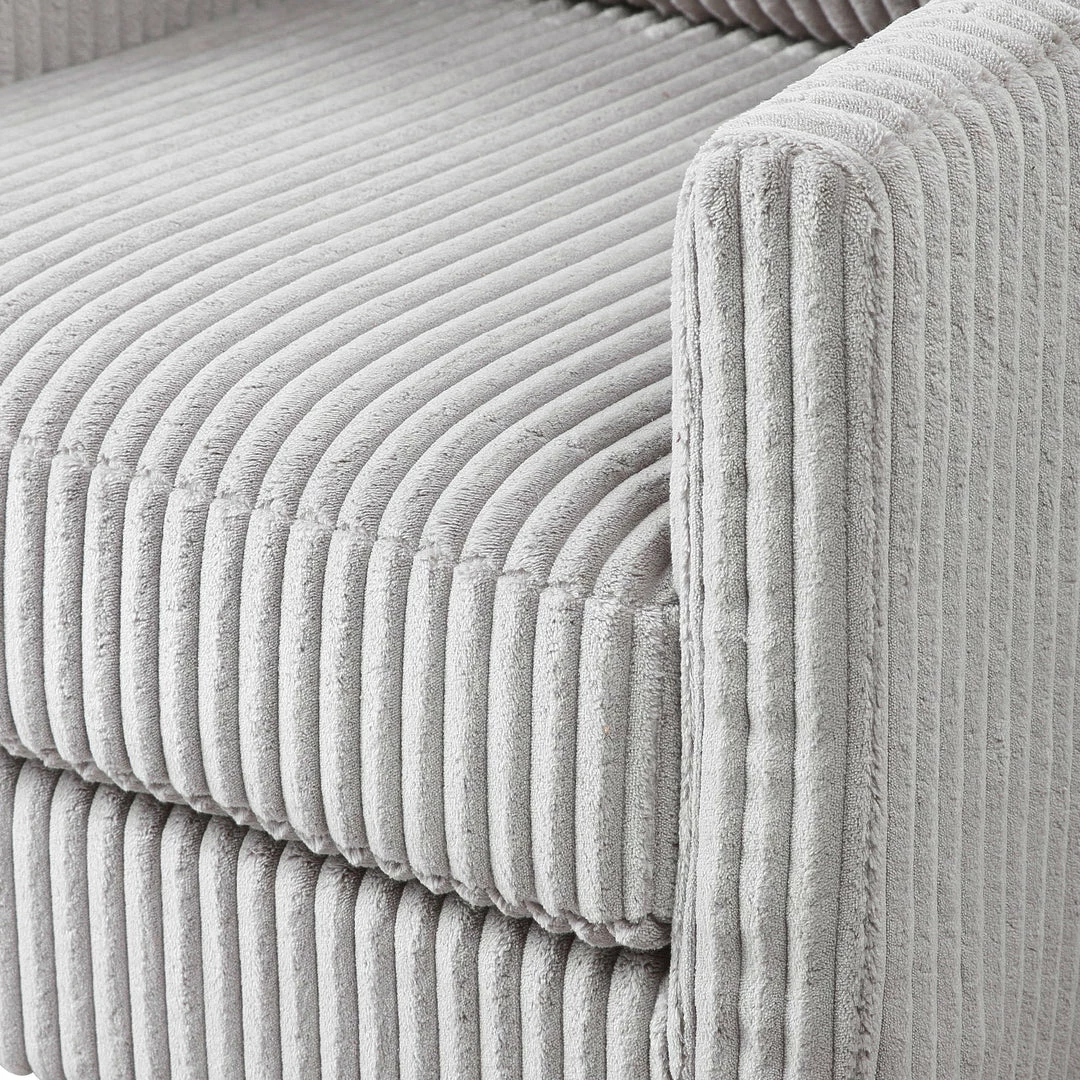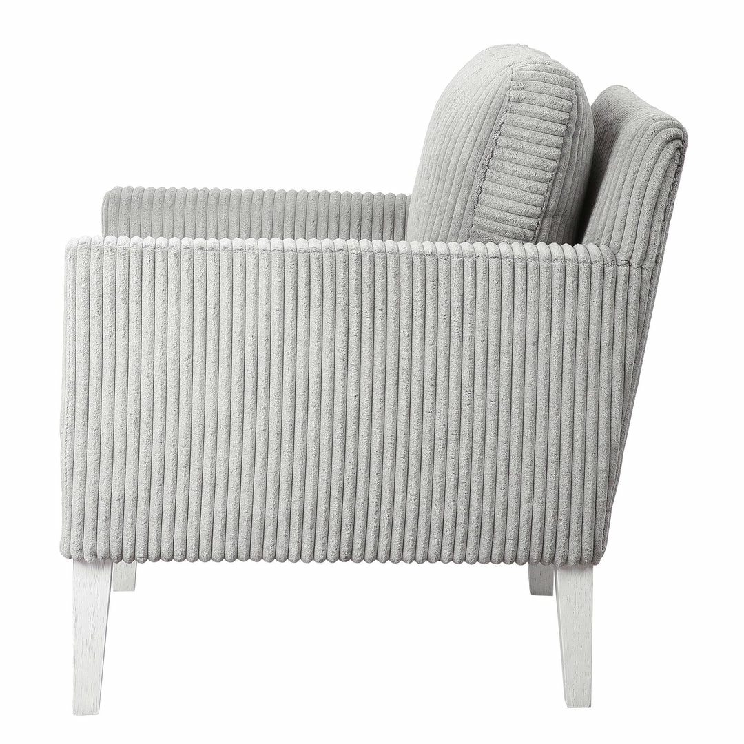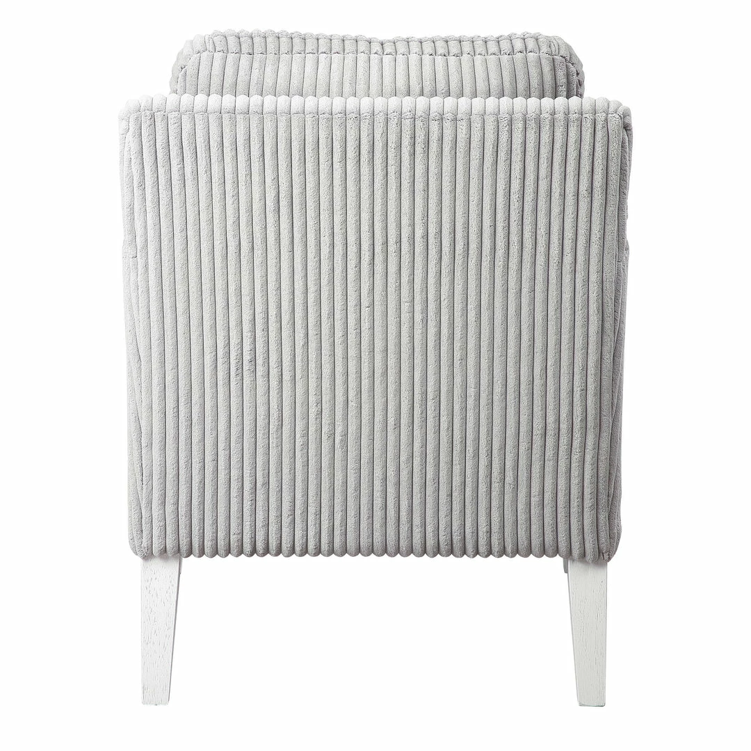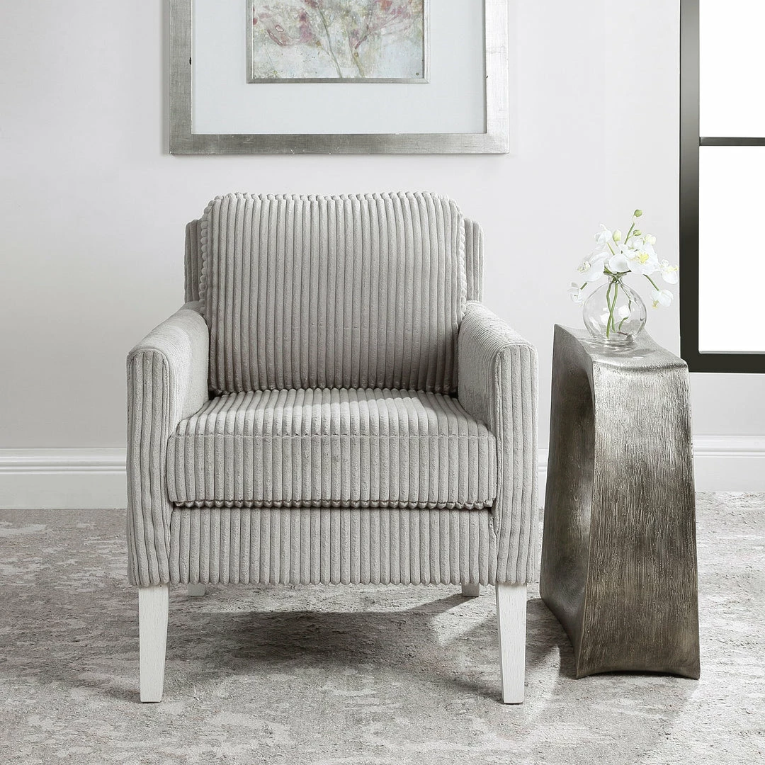 Blending Style And Comfort, This Fashionable Accent Chair Is Covered In A Luxurious Fluted Steel Gray Fabric And Is Accented By White Oak Finished Legs With Naturally Distressed Details. Seat Height Is 20″.
