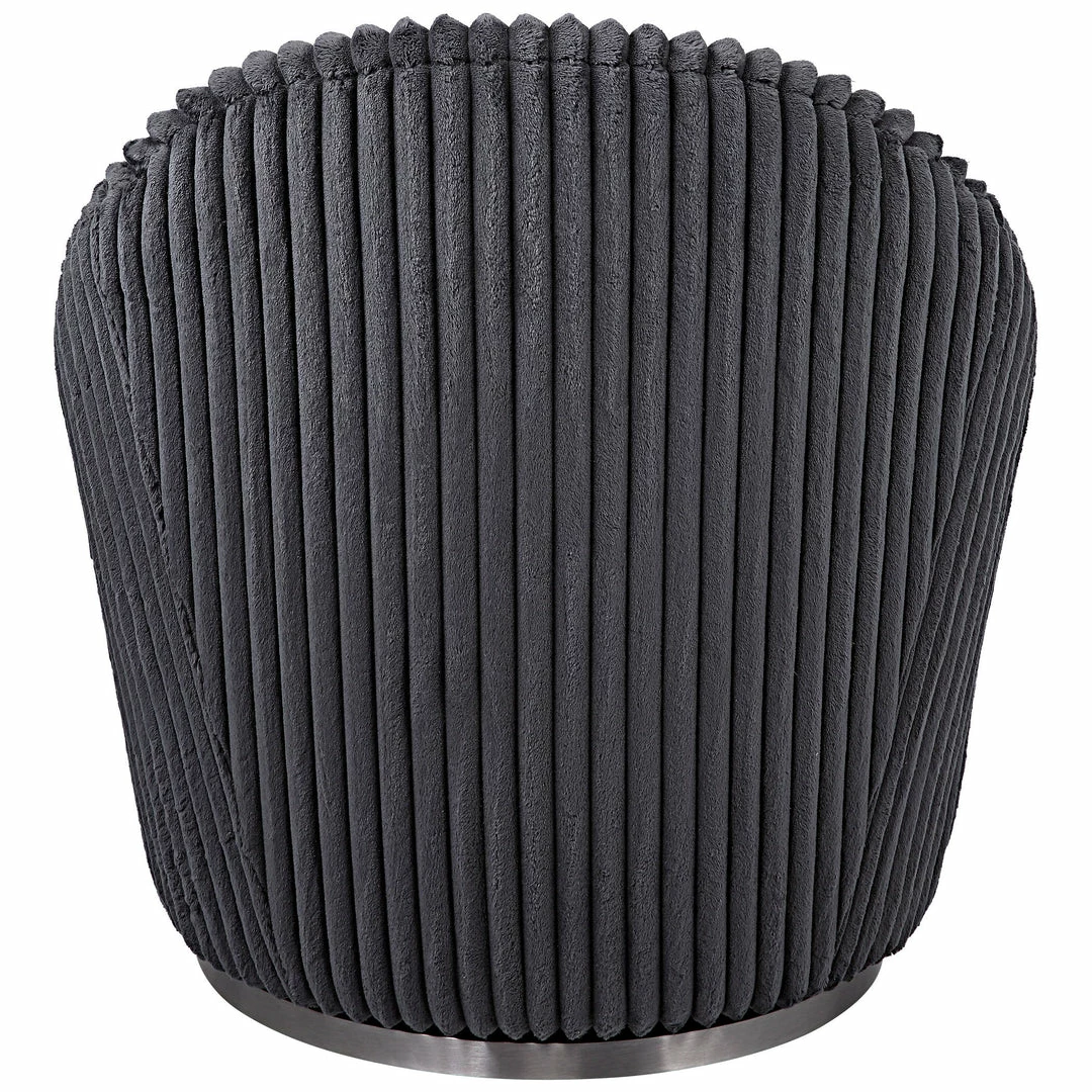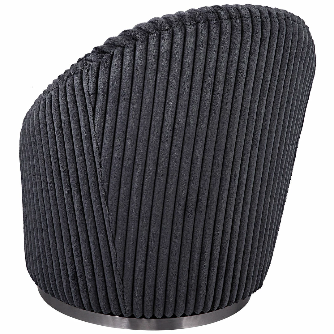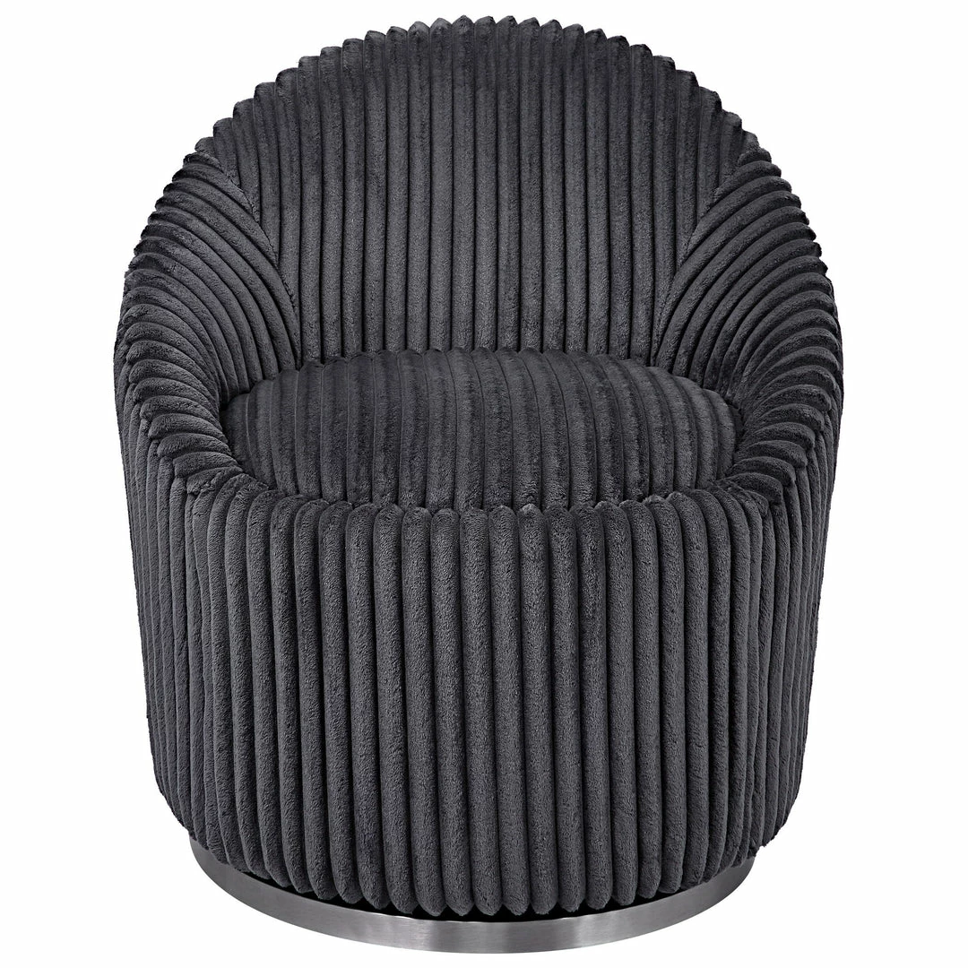 A Contemporary Accent With A Modern Edge, This Chair Is Upholstered In A Luxurious Fluted Gunmetal Chenille Fabric And Is Accented By A Stainless Steel Swivel Base Finished In Brushed Nickel. Seat Height Is 19″.