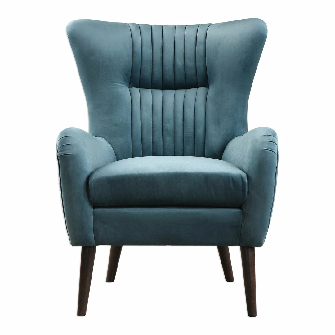 Add A Fresh Jewel Toned Touch To Your Space With This Mid-century Styled Accent Chair Featuring A Flare Black And Channel Tufted Accents. Its On-trend Teal Blue Polyester Velvet Is Finished With A Welt Trim, On Tapered Birch Legs Stained In A Rich Espresso. Seat Height Is 20″.