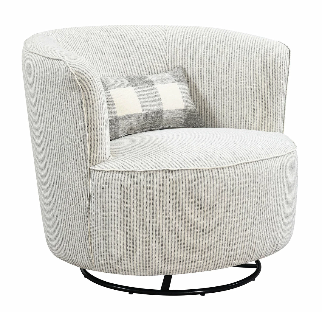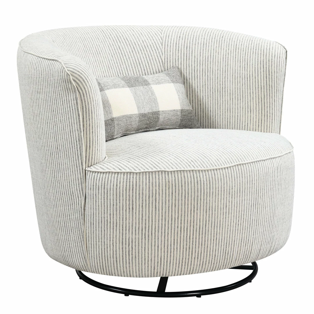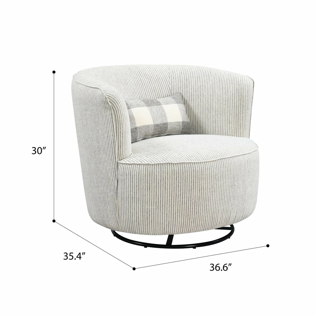 - The Benzley swivel glider accent chair brings a modern vibe to your space in a fresh, sophisticated look. This barrel back swivel accent chair is paired with a supportive kidney pillow in a pop-of-interest print for a design that’s one-of-a-kind.