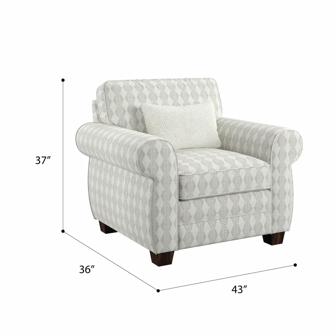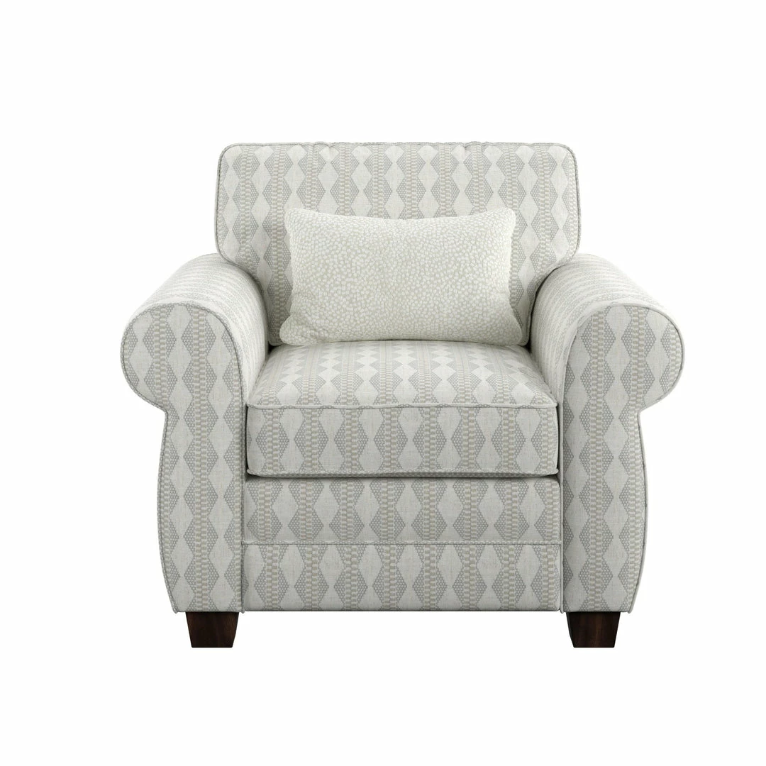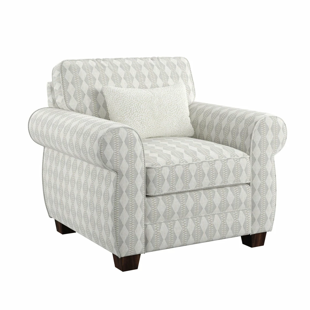 High contrast and eye-catching patterns make the Royce collection an extraordinary transitional design. The closer you get, the more the details come alive from the abstract leaf print on the ottoman and pillows, to a linear geometric print on the accent chair and additional pillows, and an unforgettably cozy boucle kidney pillow. All these creamy-toned pillows flatteringly coordinate with the cool gray body fabric on the sofa and loveseat. Finished off with welted details and classic rolled arms, the Royce will be the timeless additional to your home.