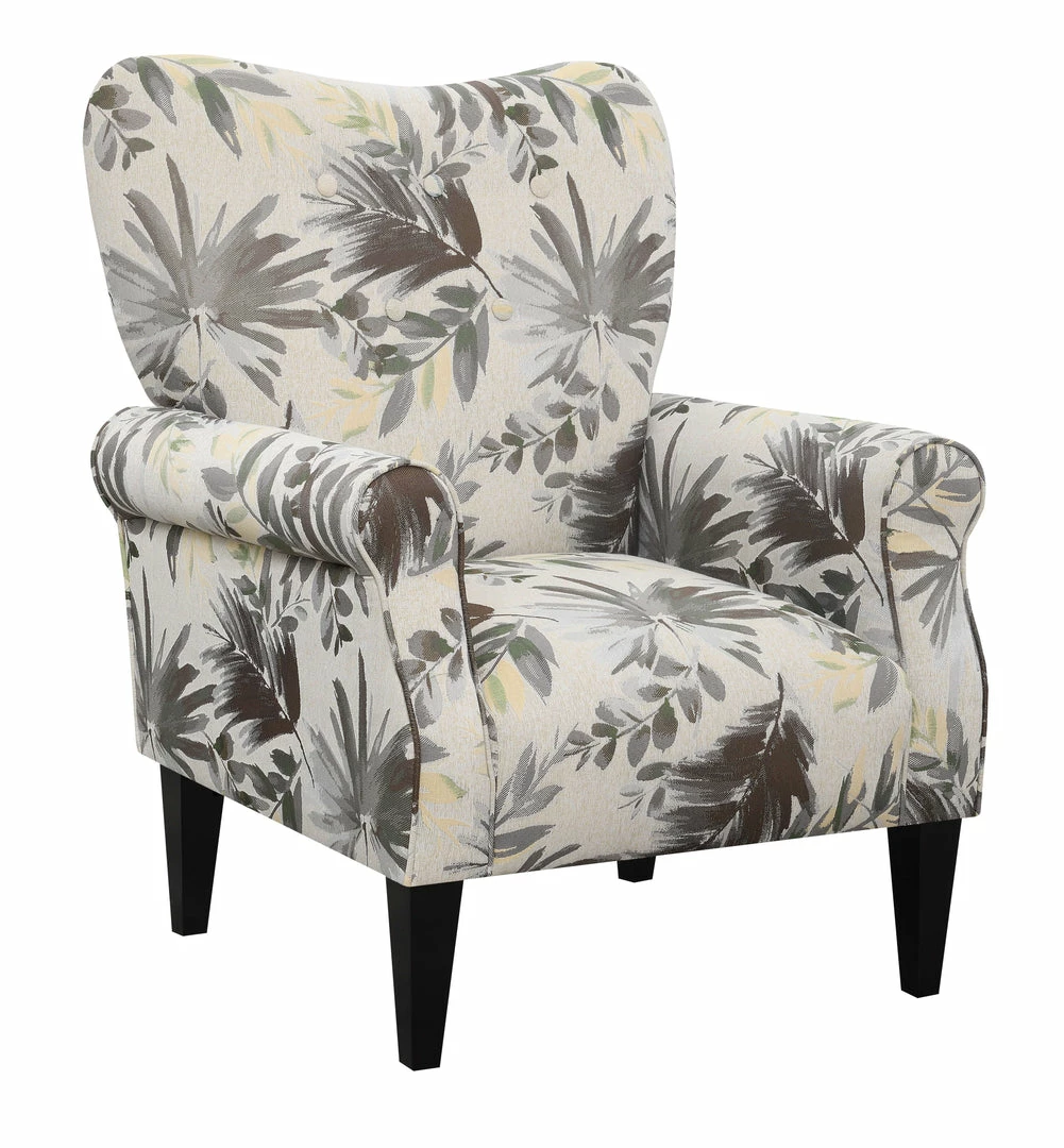 The Lydia chair is designed with a classic silhouette and features a well-tailored, shaped backrest with button accents. A hardwood frame creates the base for foam encased pocketed coil cushions with sinuous spring support, all wrapped in patterned linen-like cover welted at the arms. Finished with tapered, solid-wood high legs, the Lydia chair is a stunning yet comfortable seating choice sure to make a scene-stealing statement.