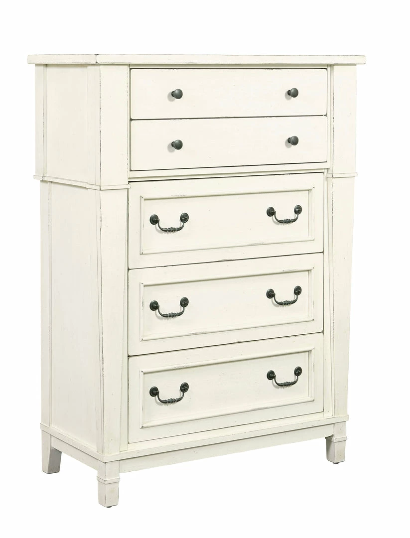 - The Stoney Creek 5-drawer chest offers large-scale designs combined with a textured, antiqued white finish. Giving additional charm, the antiqued, blackened metal hardware and tapered leg details complete this relaxing retreat.