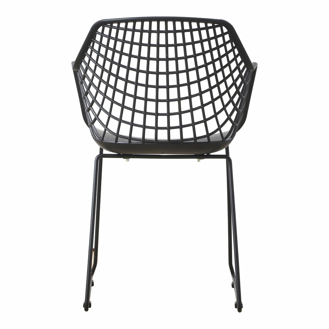 Practical in black and easy to clean with an openwork back, curved form, and sloped armrests, this chair design is versatile to an array of outdoor and balcony layouts.