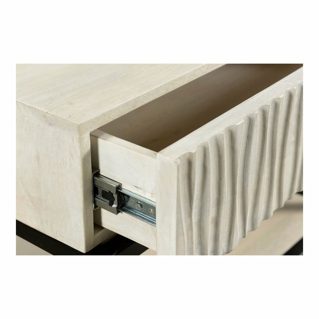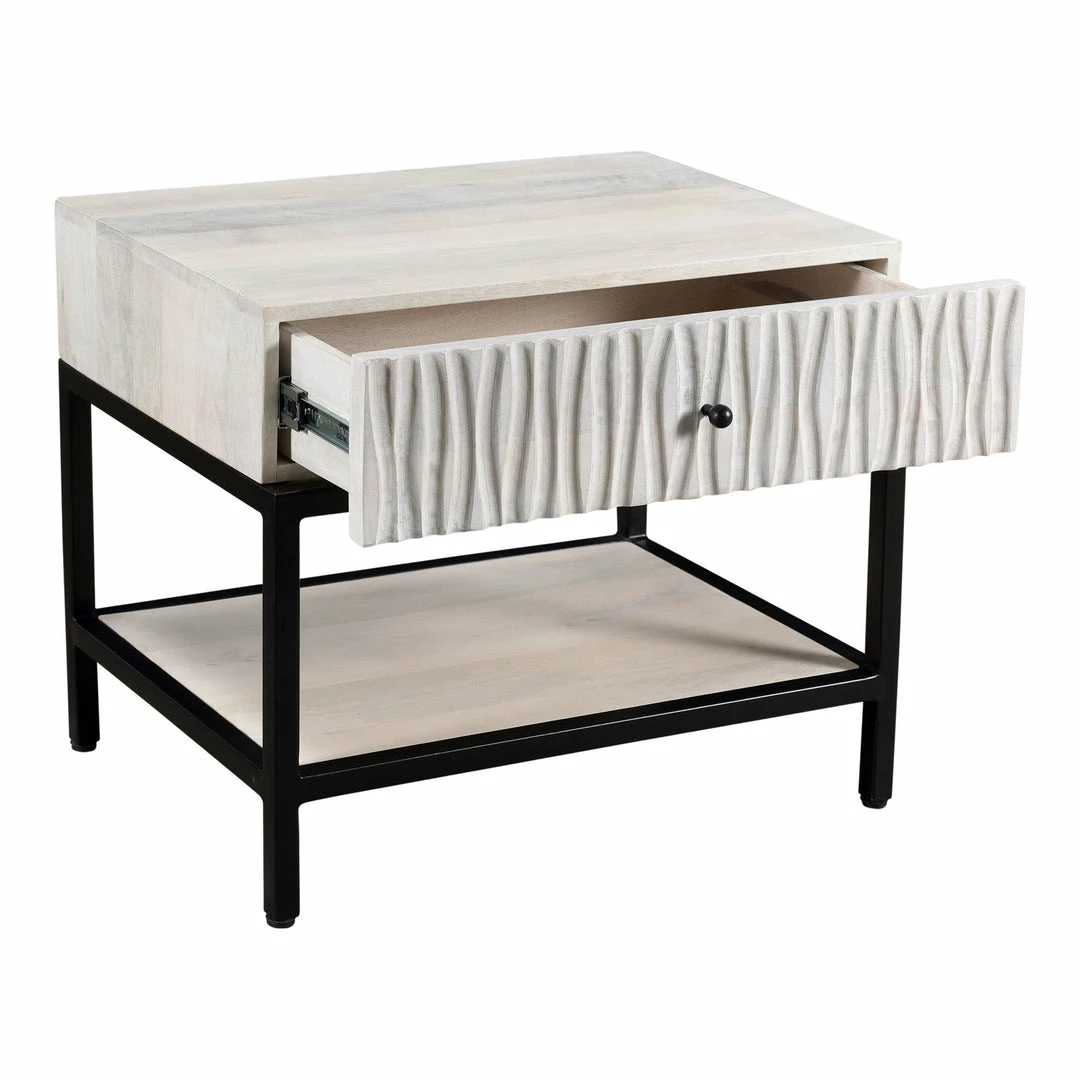 The contemporary designed Faceout nightstand is constructed with solid mango wood with the intention to last. The whitewashed finish creates a rustic effect, while its powder-coated iron base provides a modern feel to any bedroom space. A single large drawer compartment and a shelf gives you an ample amount of space to store all your essentials.