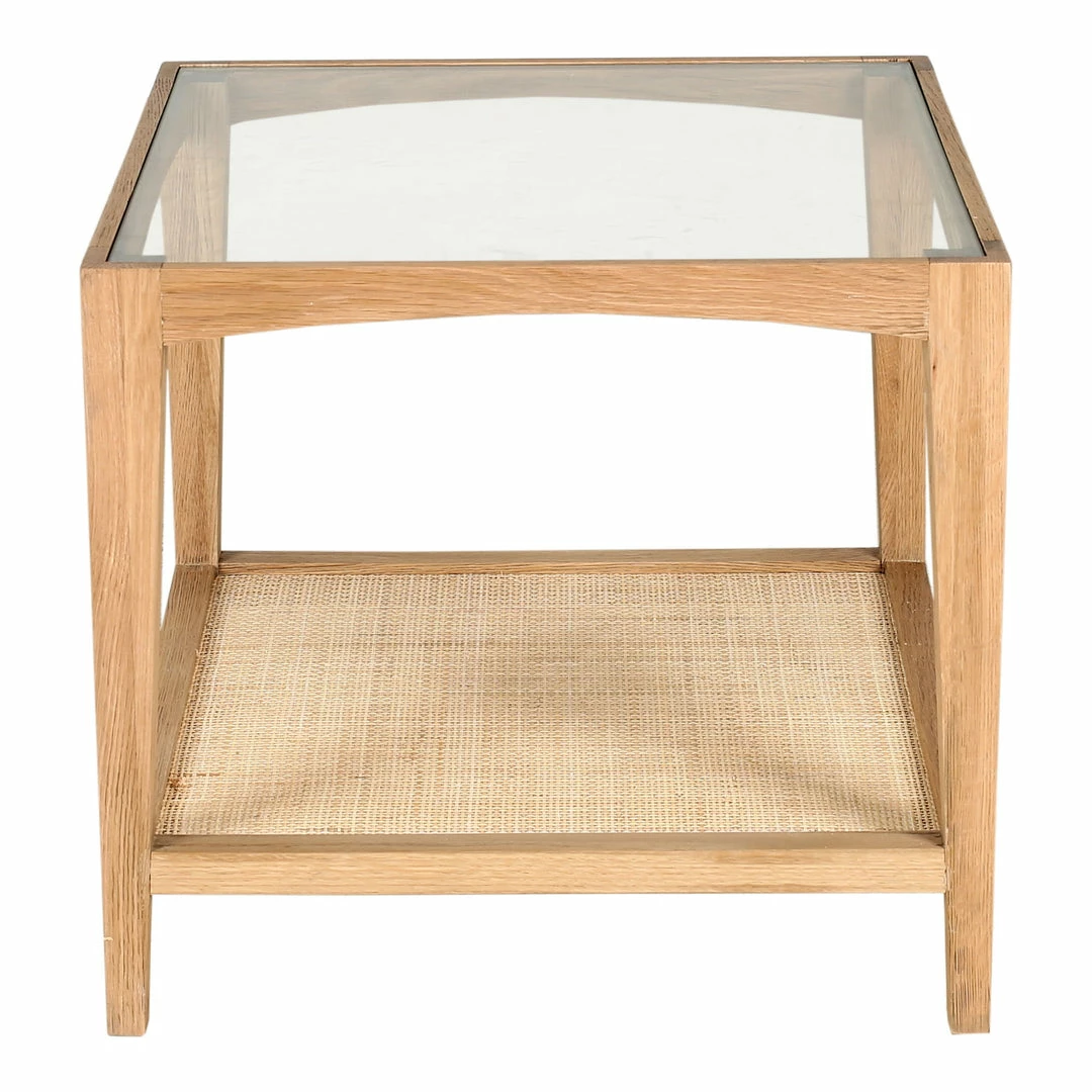 The Harrington side table features a sculpted frame made of solid oak, with a tempered glass tabletop and lower shelf woven from natural cane. Natural wood textures and colors combine to create a modern rustic standout.