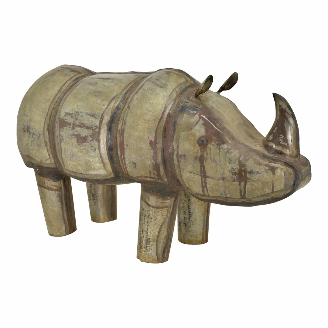 A whimsical Rhino crafted out of iron. This large metal statue has an artisanal-character about it, with visible welding and finishing marks. Each rhino is hand-made and finished, making each statue a unique and interesting accent.