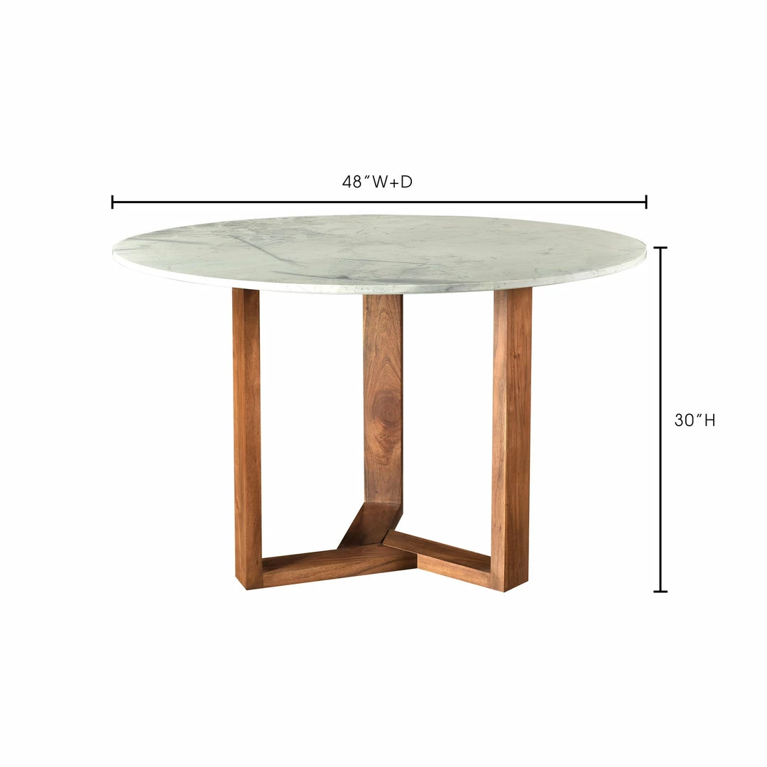 The Jinxx dining table has a polished marble surface and a base of acacia wood. A deceptively simple design gives this scandi-inspired table its chic look.
