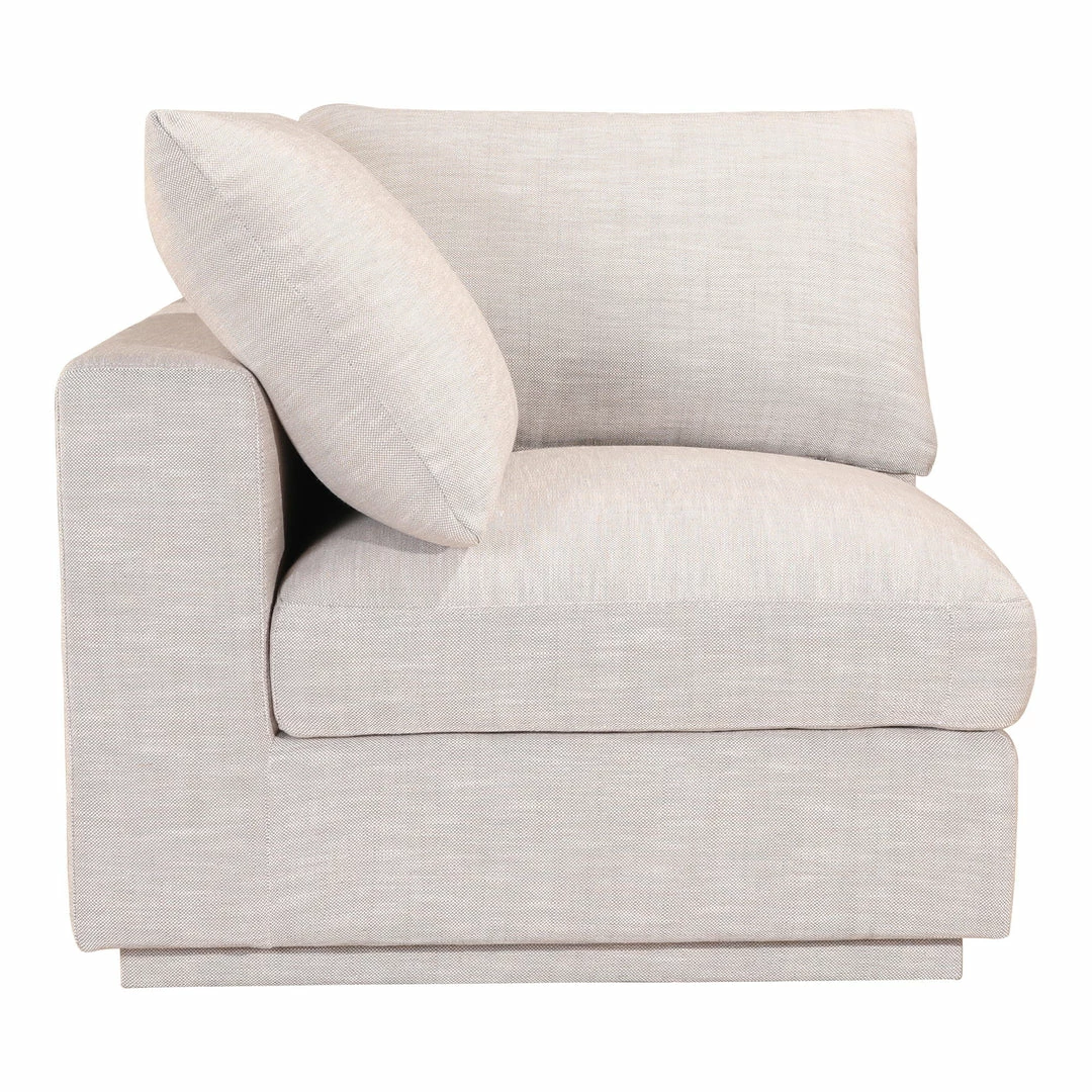 This Justin corner chair offers a bright, seamless design. The taupe linen-polyester upholstery makes it a versatile piece for different spaces.