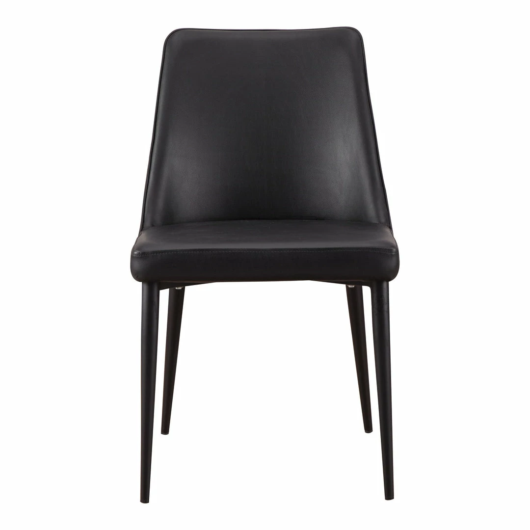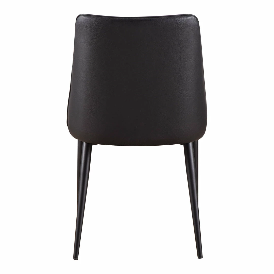 The Lula dining chair features sleek black vegan leather upholstery along with a comfortable scooped seat. With a sturdy iron frame and slim, tapered legs, this dining chair brings effortless style to your living space.