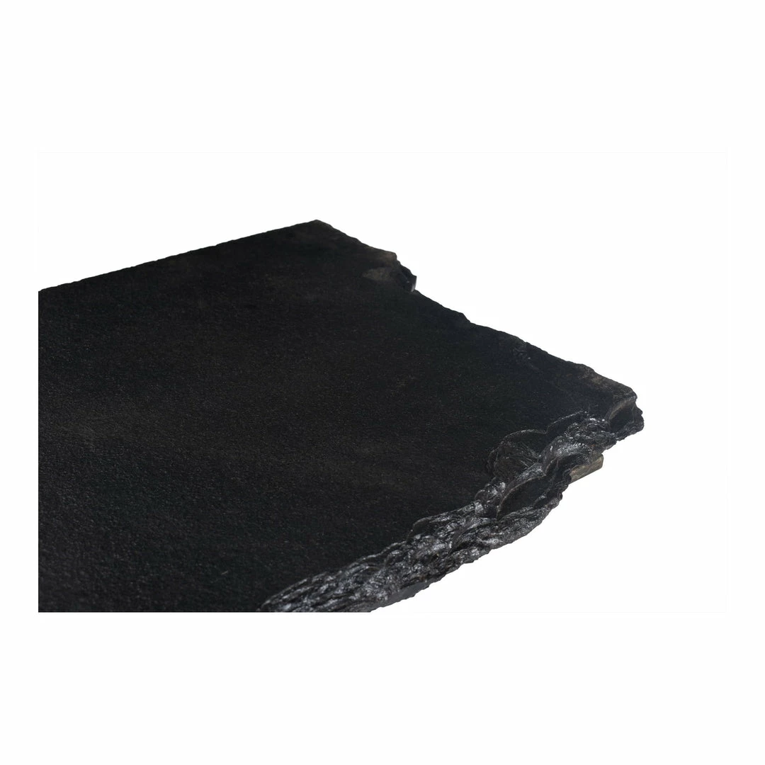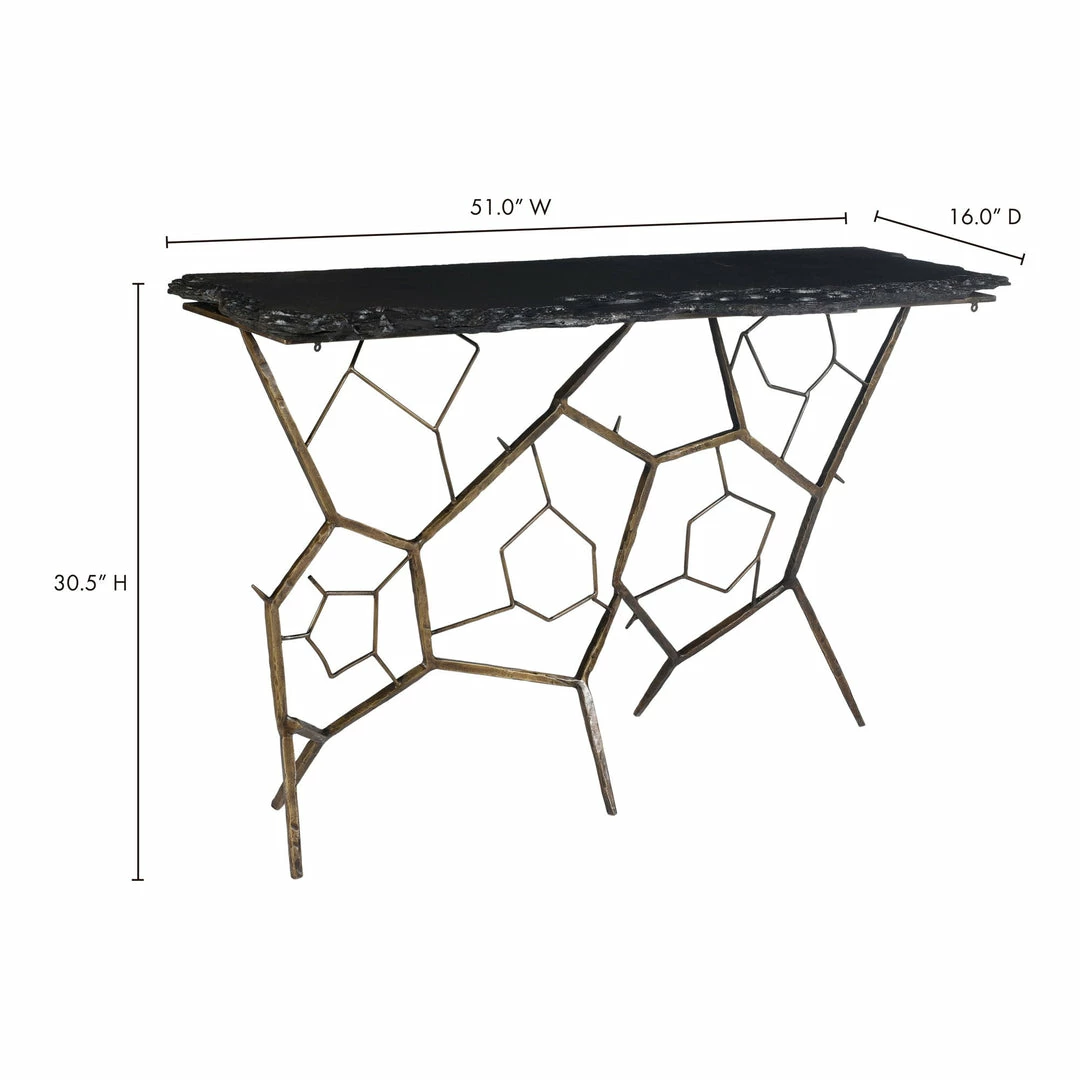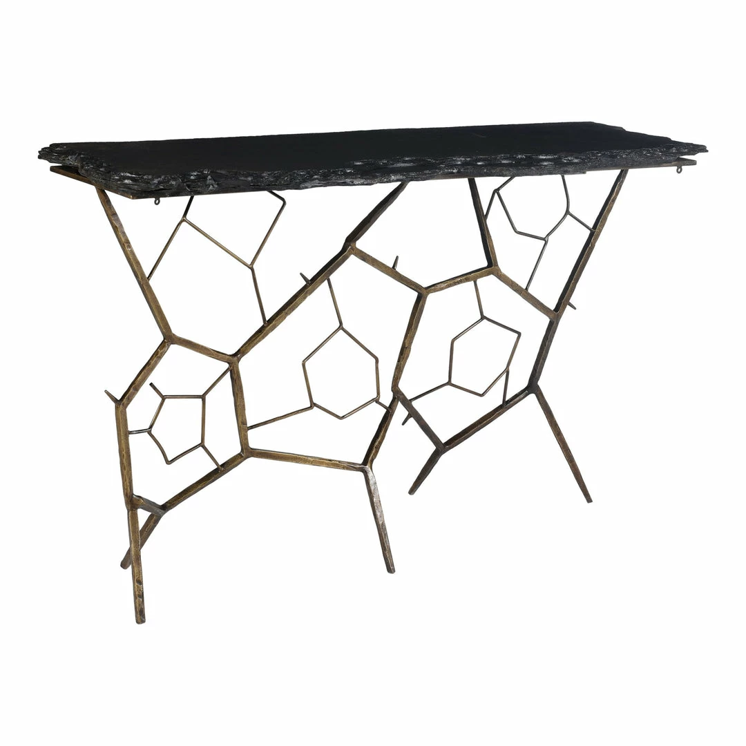 This slate console table has stark contemporary design, with its rough black stone surface and iron construction. A bold piece.