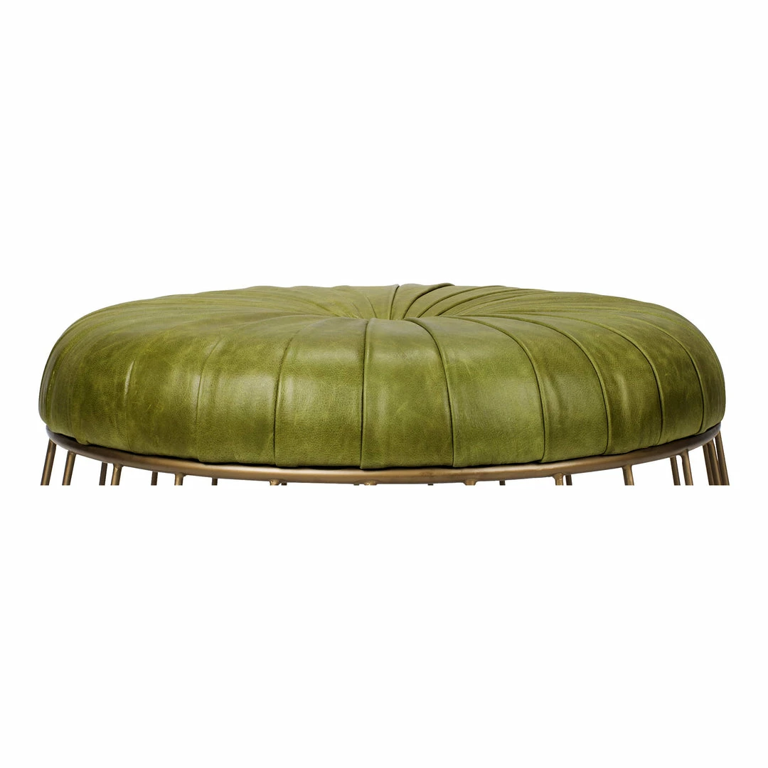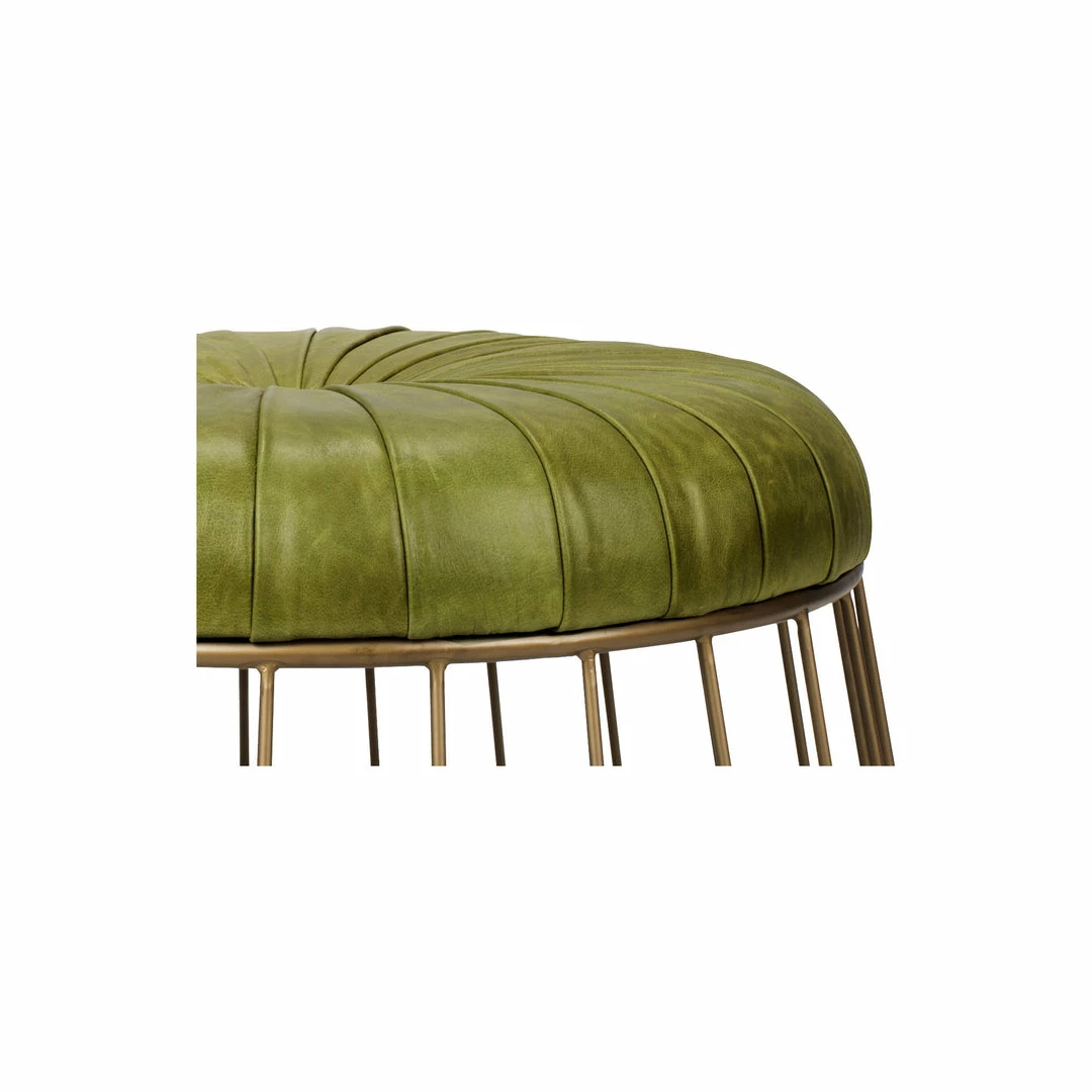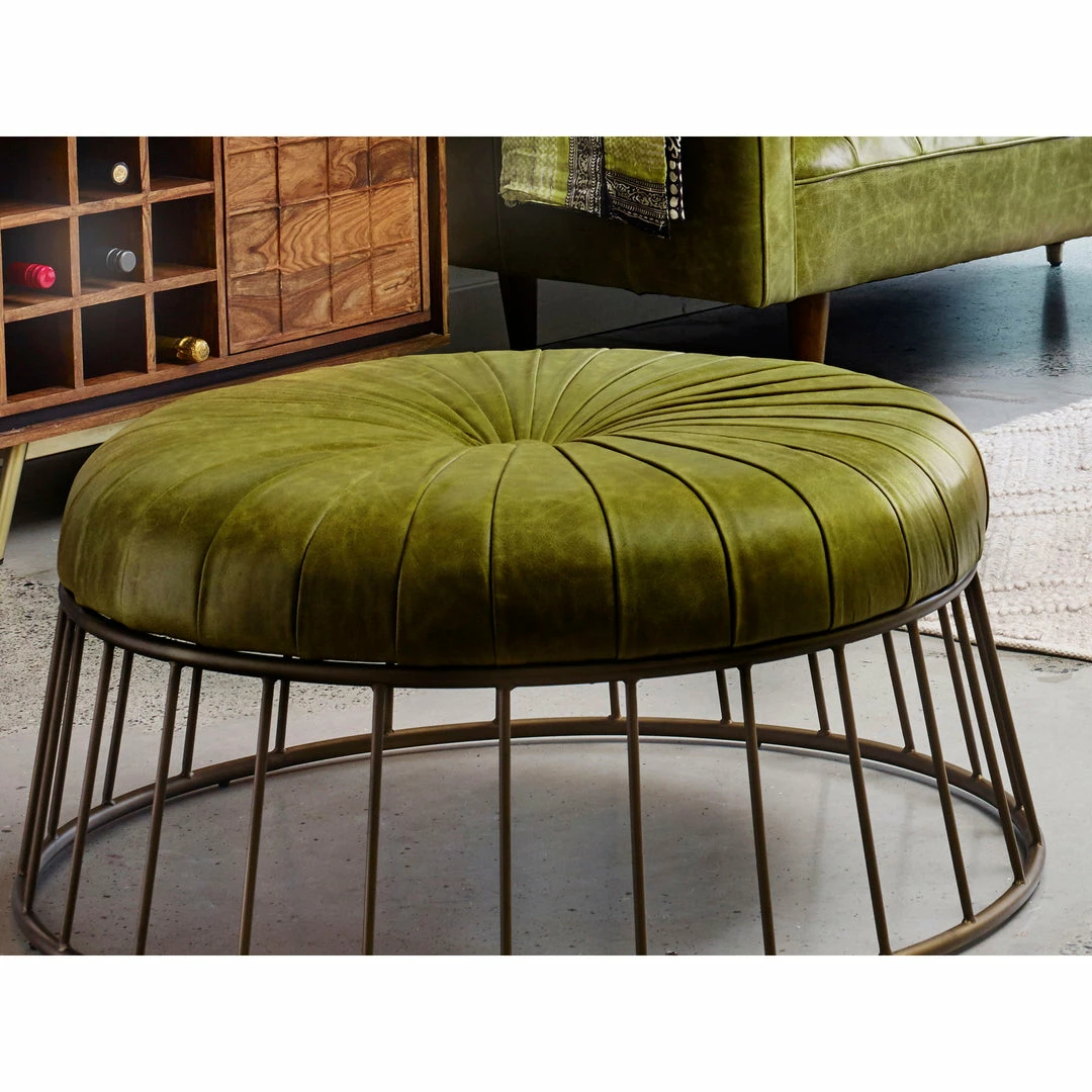 This charming retro-inspired Ottoman has a caged iron base to support its luxurious green leather cushion.