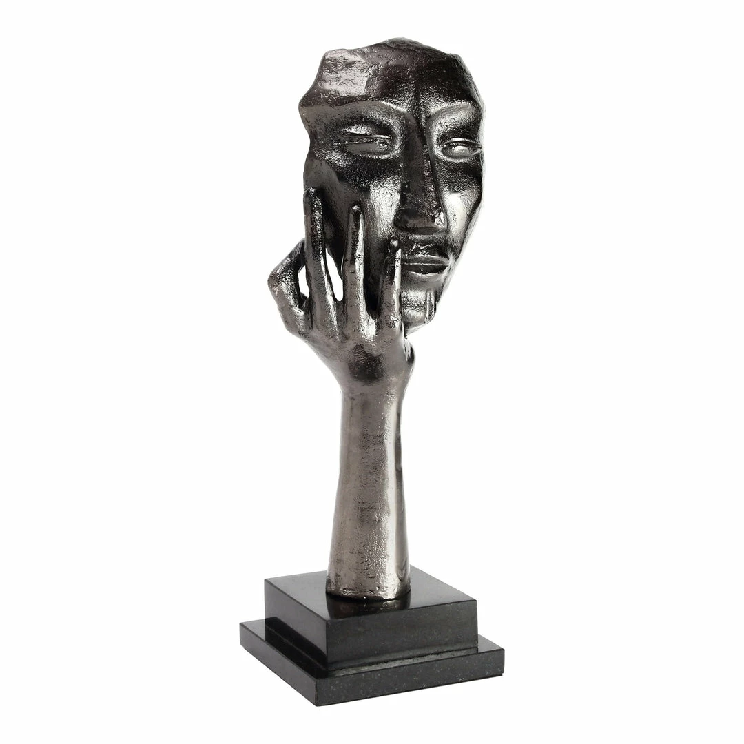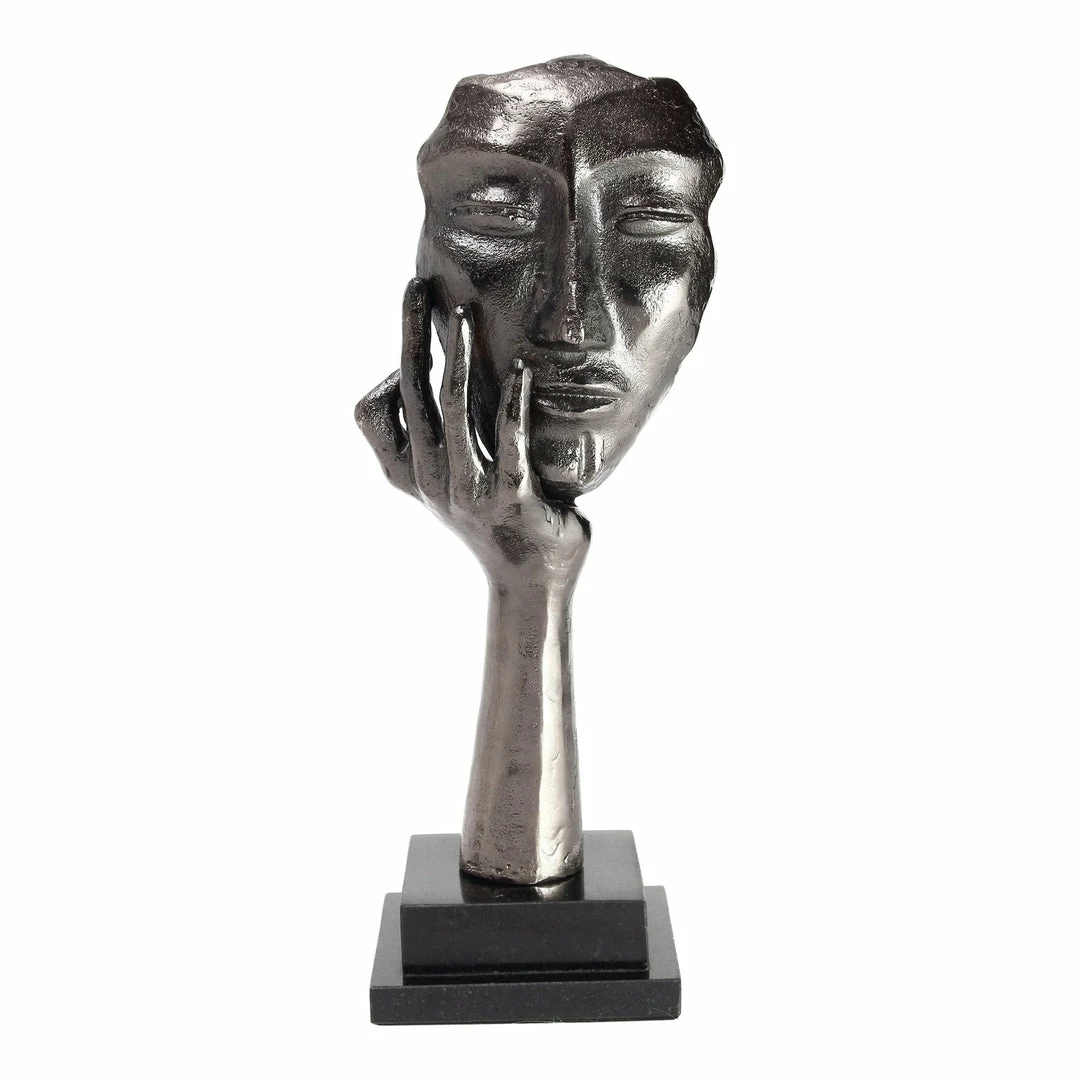 A single hand holds a perched face with eyes closed, showcasing intense contemplation. Elevate your living space with the contemporary art of the Ponder statue