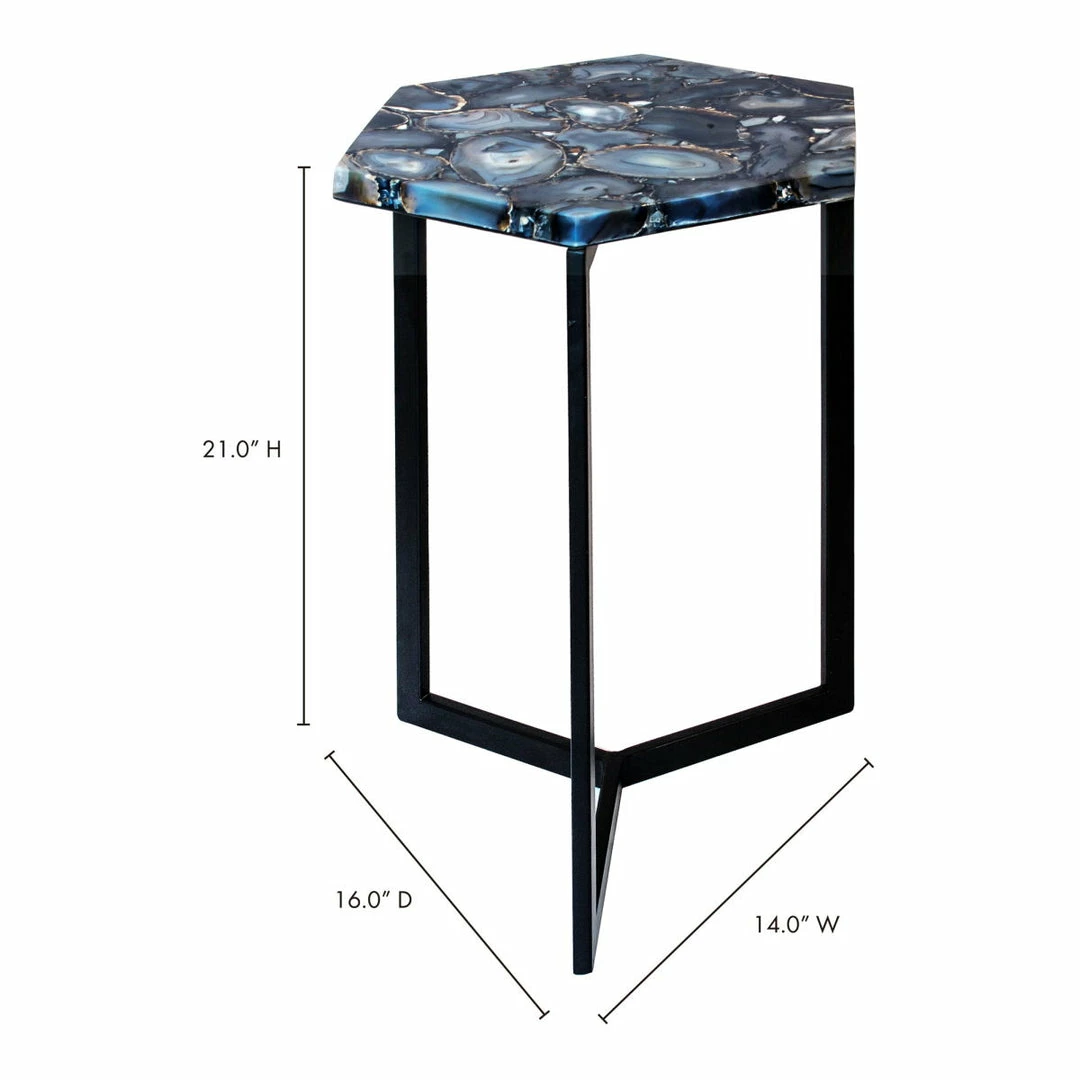 - Solid iron base with a blue, grey and metallic agate tabletop