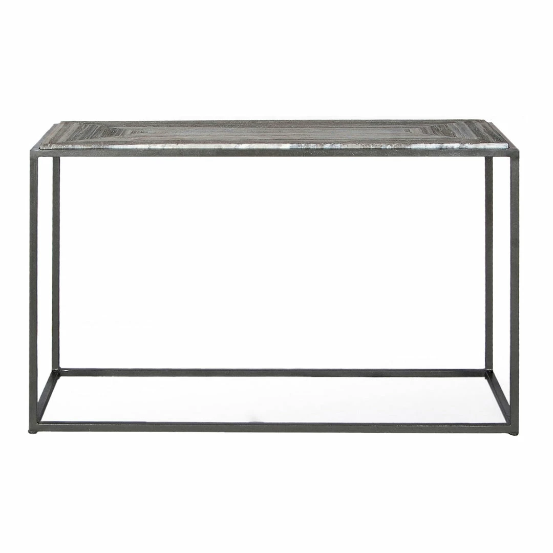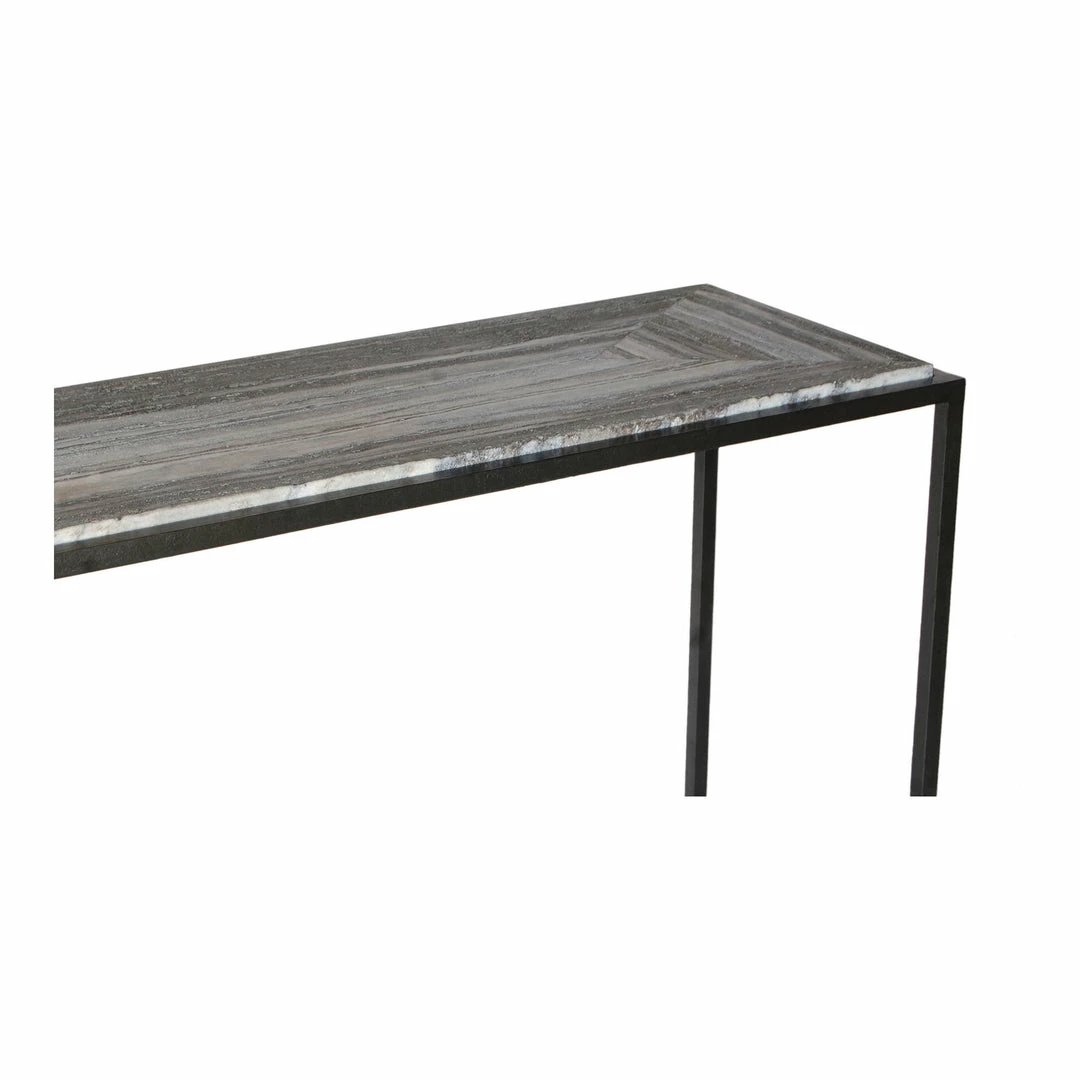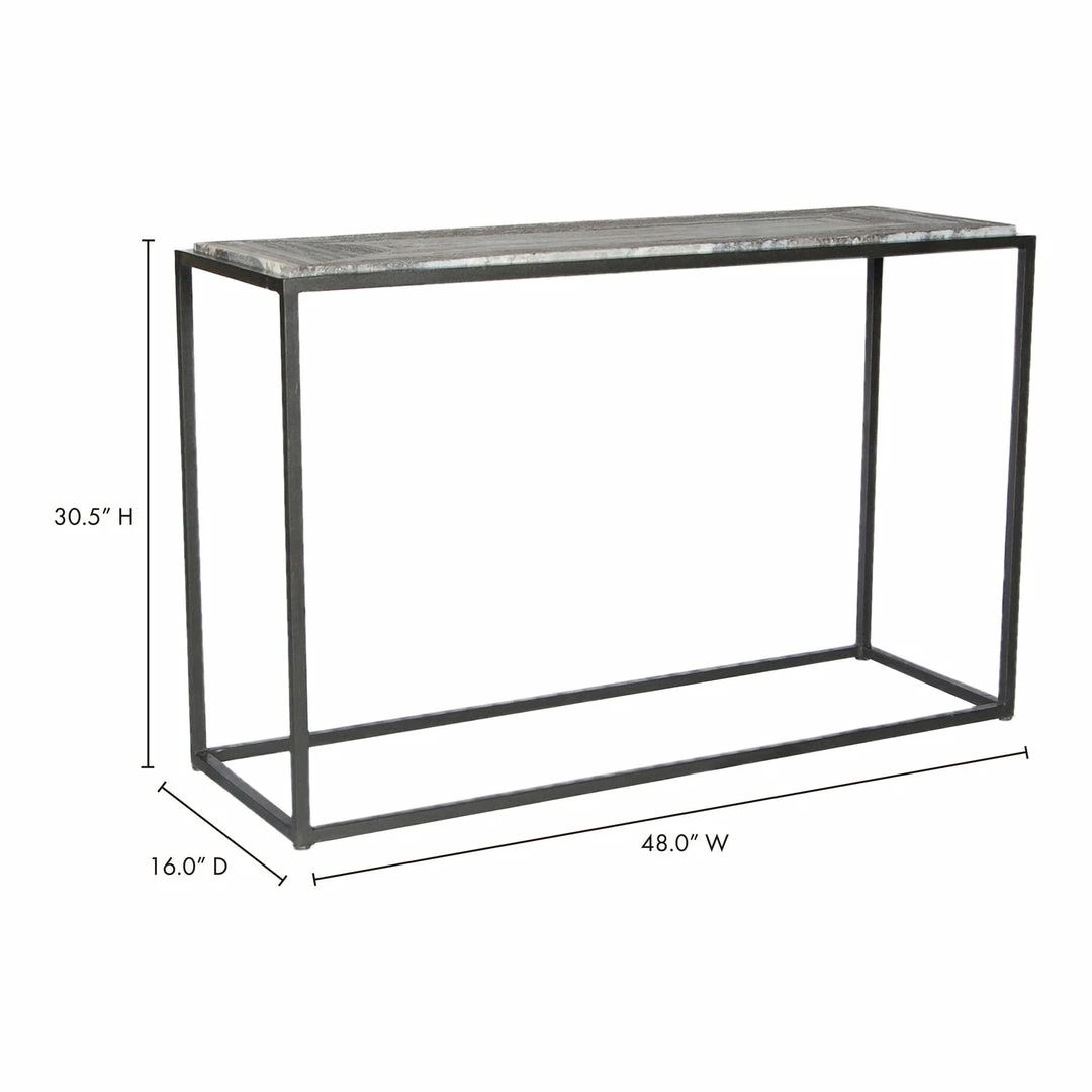 The Winslow console tableโs charcoal marble surface soars above an industrial iron frame. An attractive contemporary piece.